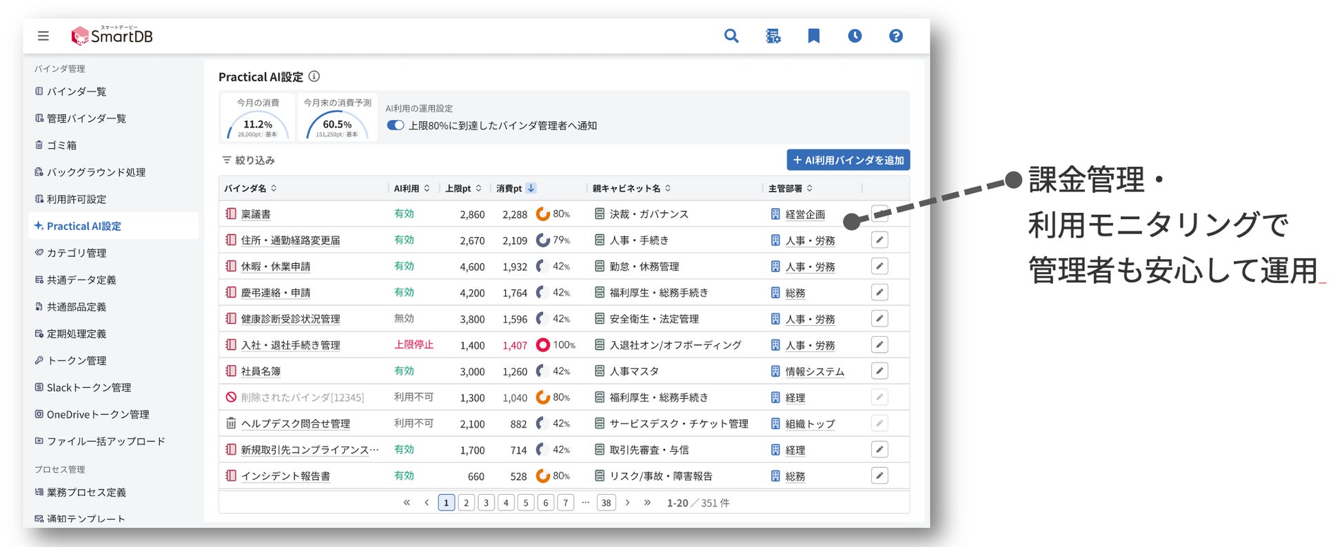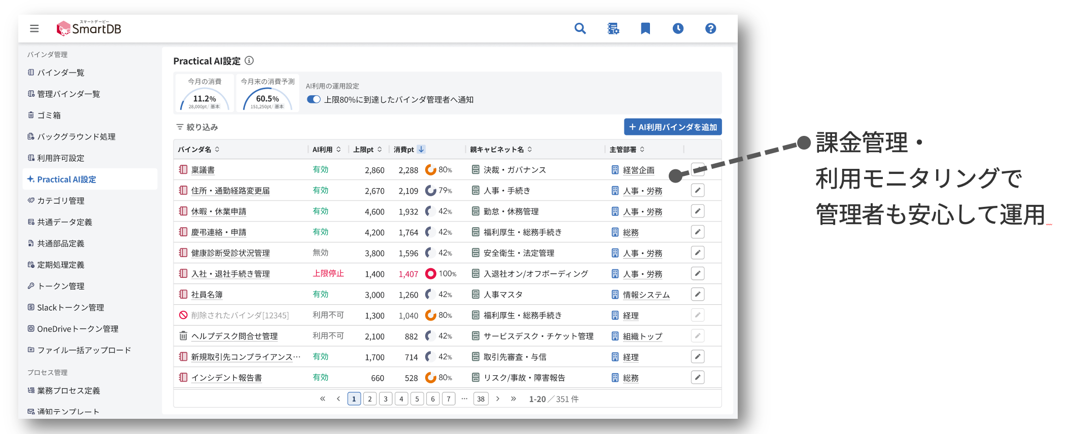 AIの利用状況やポイント(トークン)消費量を可視化し、コストの最適化と、過剰・不正利用の防止につながるガバナンスを実現します。