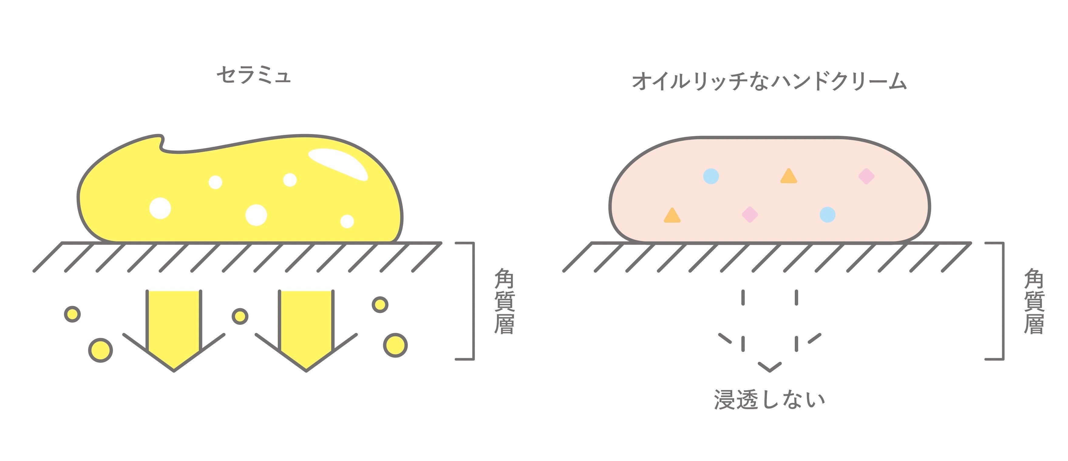「セラミュ ハンドジェリー」はオイルフリーで、肌の上に油分の膜がつくられないため、水分が角質層にぐんぐん浸透する仕組み。ハンドクリームにオイルリッチな使用感を求める人の満足は得られません。オイルリッチなハンドクリームとの場合、油分と水分が含まれているため肌の表面に保湿感や膜感を感じ、べたつきと感じられることもあります。「セラミュ ハンドジェリー」は、肌の上に油分の膜を作らないので、塗り重ねをしても水分が浸透※2。1日に何度も重ねて使用しても角質層に潤いを与え続けます。