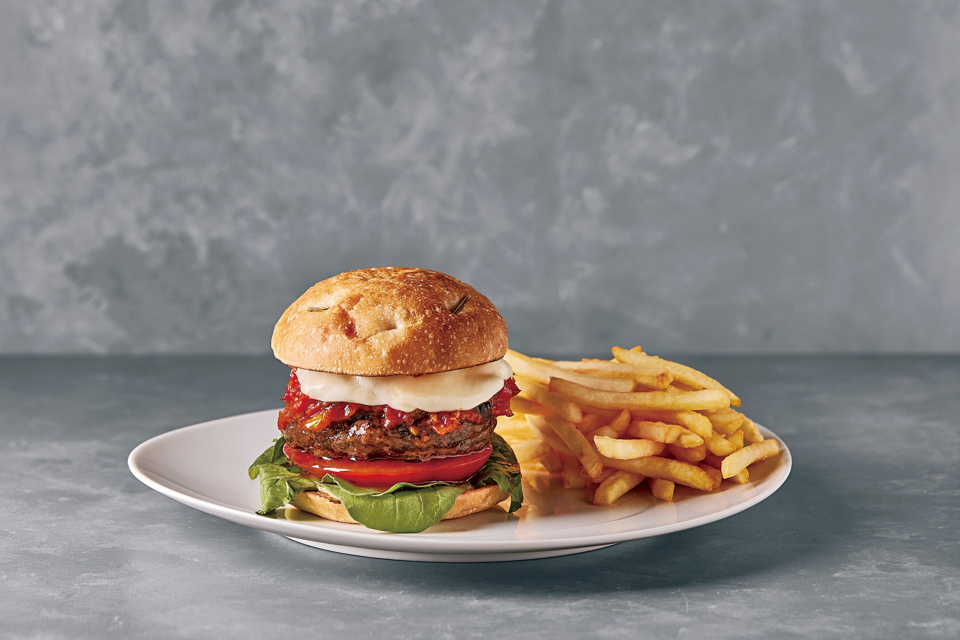 イタリアンならではの食材や定番の味付けを取り入れたオリジナルバーガー。チリオイルや黒胡椒でほんのりスパイシーな風味に仕上げたカポナータソース、ジェノベーゼを混ぜた自家製バジルマヨネーズ、その上にモッツァレラチーズをたっぷりとトッピングし、ローズマリーを練りこんだホテル自家製フォカッチャでサンド。パティは140グラムのオーストラリア産の赤身肉を使用。一緒にサンドするルッコラの風味が程よいアクセントとなり、さっぱりとお召し上がりいただけるバランスの良いイタリアンバーガーです。