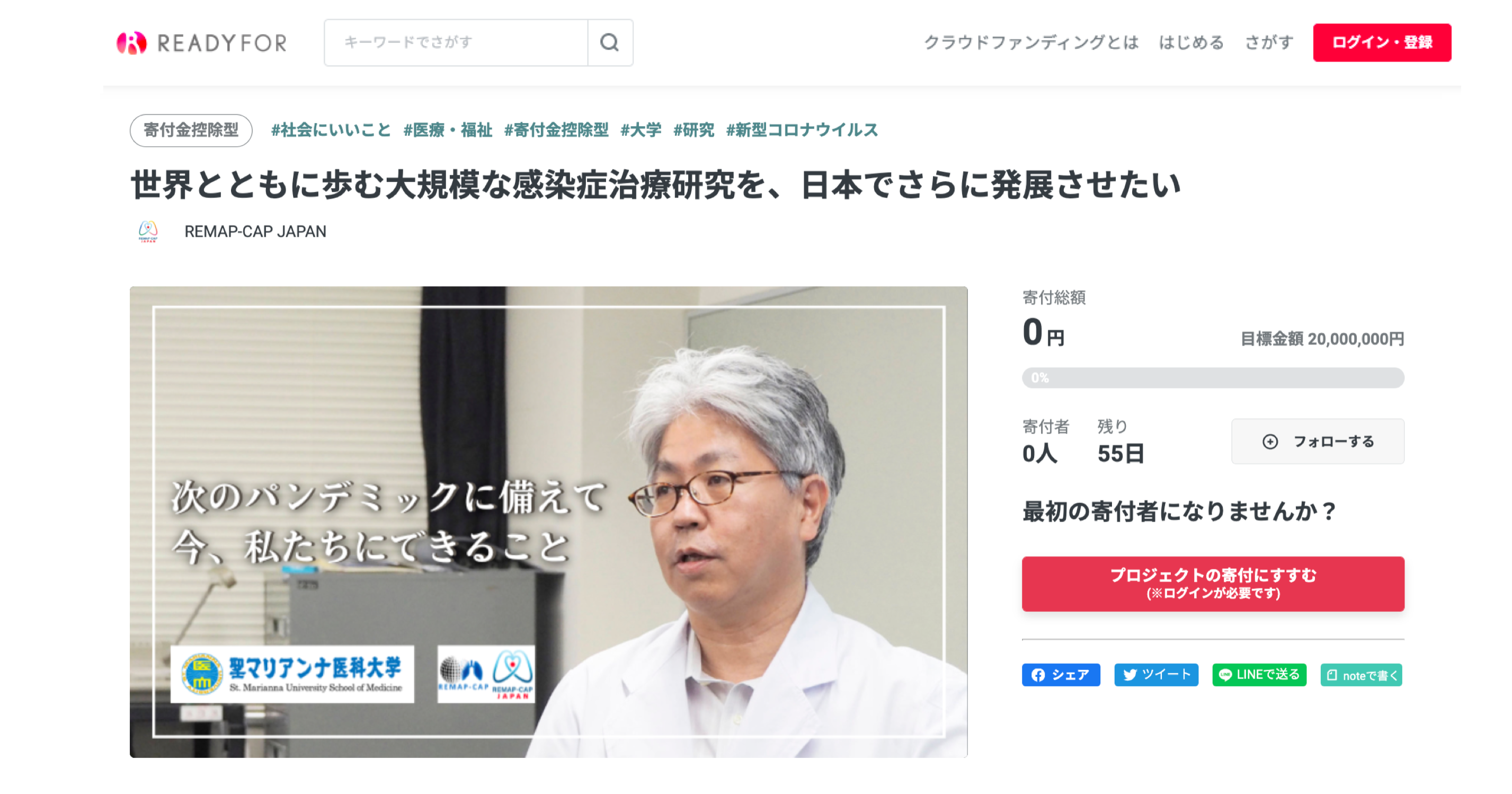 ・概要 :REMAP-CAP(A Randomized, Embedded, Multifactorial, Adaptive Platform trial for Community-Acquired Pneumonia)とは、世界中の医療者と協力し、重症市中肺炎の最適な治療法を早期に見出すことを目的とした大規模国際プラットフォームでCOVID-19を含む呼吸器感染症・重症市中肺炎の研究に関わっています。新型コロナウイルス感染症に限らず、今後起こりうる感染症・パンデミックにいち早く対応していくため未知な治療法を効率的に研究する体制を構築するためにクラウドファンディングプロジェクトに挑戦します。