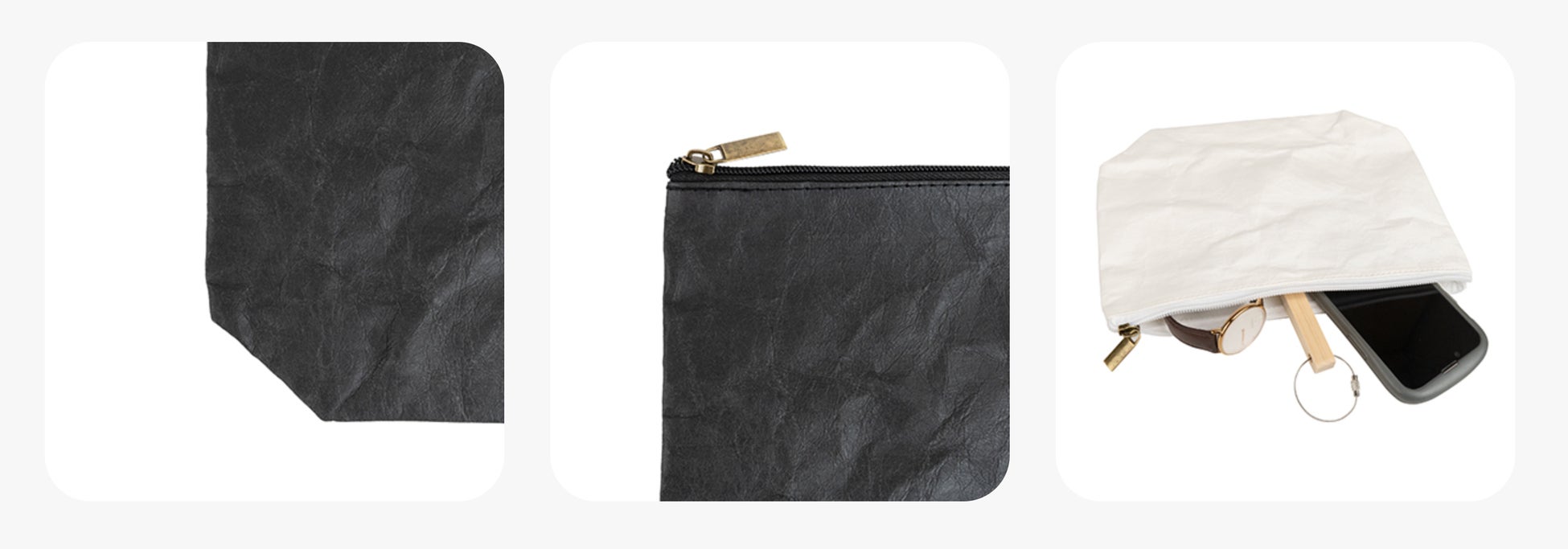洗える紙素材を活用したポーチ。表面の生地は分厚く丈夫で、シワ感が上品な革素材のような印象をもたらします。小物が4〜5個程度入る大きめのポーチで、温泉やお食事処など館内に持ち歩くのに最適な大きさです。