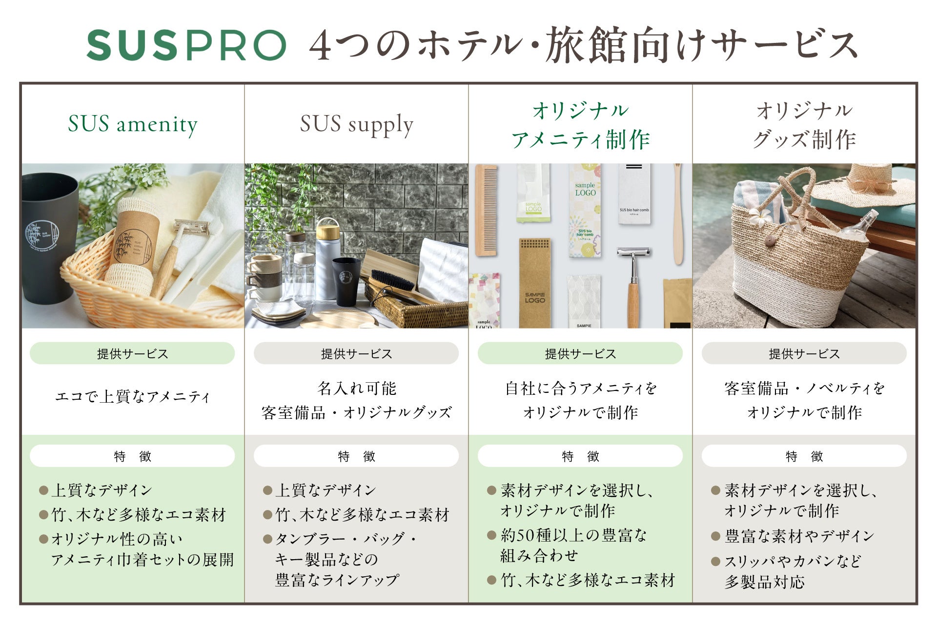 当社は2021年9月以降、ホテル・旅館向けにサステナブルなオリジナルグッズ制作ブランド「SUSPRO」を展開。今回加わったSUS supplyと合わせて、4つのブランドを展開しています。