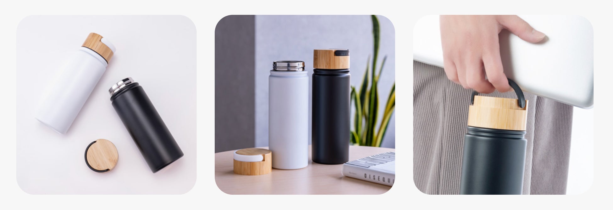 エコな竹素材を蓋に活用したステンレスボトル。蓋の竹の木目が自然由来の優しい風合いを感じさせます。サイズは350ml、500mlと2展開です。重みのあるしっかりとしたボトルで高級感があるため、開業キャンペーンやホテルのリピート顧客に向けたノベルティとしてお使いいただけます。また、ホテル業界ではウォーターサーバーの導入が進んでいるため、持ち運びできるボトル備品としてもご利用いただけます。