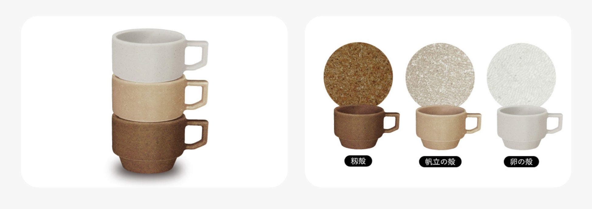 もみ殻、帆立の殻、卵の殻などの廃棄物を51%使用したスタッキングマグ。その素材の珍しさから、過去展示会に出展した際も一際注目を浴びました。本製品は積み重ねることができ、収納場所に困りません。そのため、ホテルの客室備品としてはもちろん、ノベルティとして配布することで日常づかいしやすいです。
