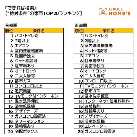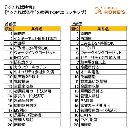 - あったらいいなが探せる“できれば条件”は、2位以下で差!首都圏では「インターネット使用料無料」が2位にランクイン、関西ではランク外。一方で近畿圏は「冷蔵庫付き」が8位にランクイン、首都圏では圏外に。