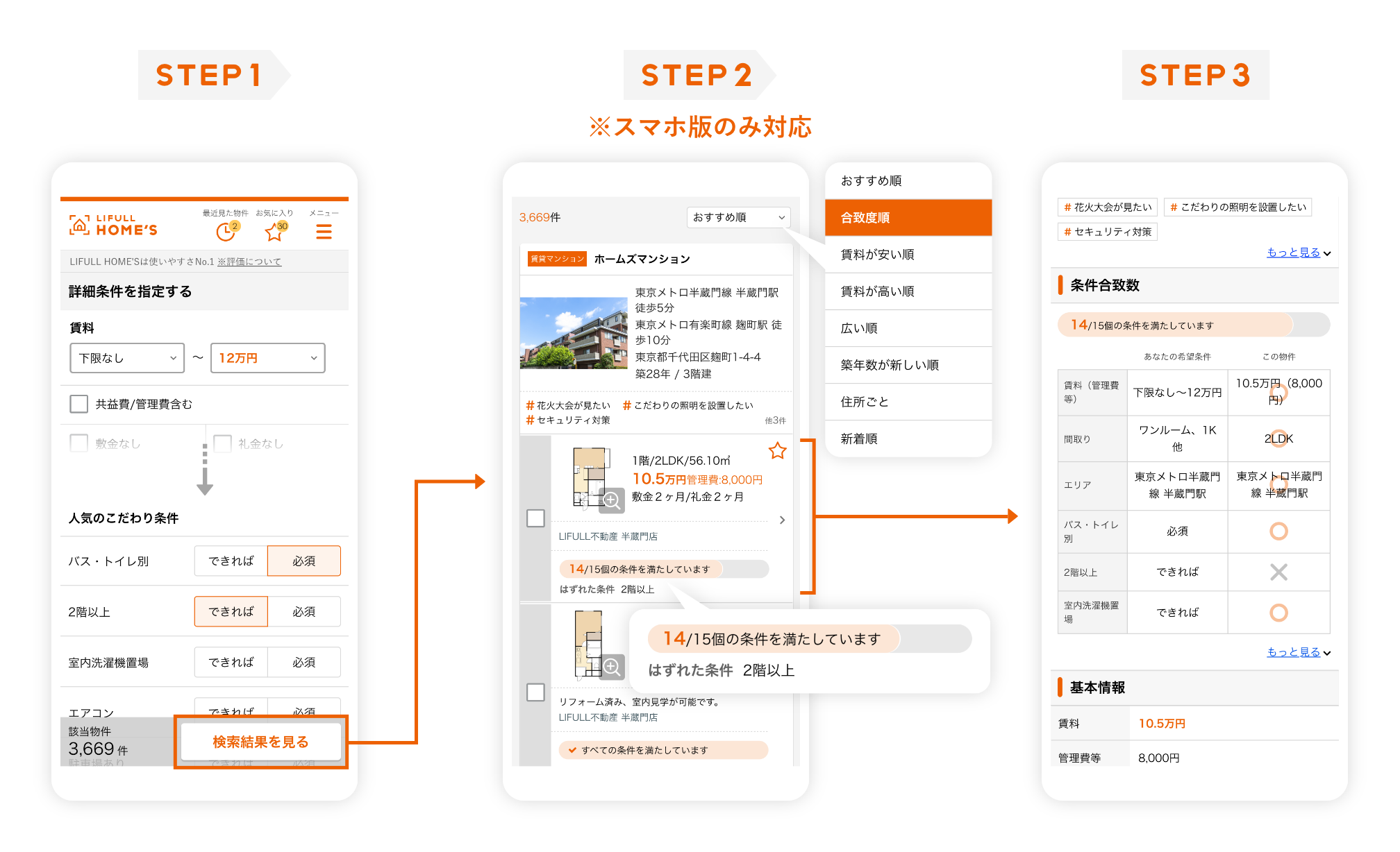 「できれば検索」は、条件を「できれば/必須」で優先順位づけをして検索でき、物件ごとに条件の合致度がすぐにわかる機能です。本機能は特許取得済みです(※4)。