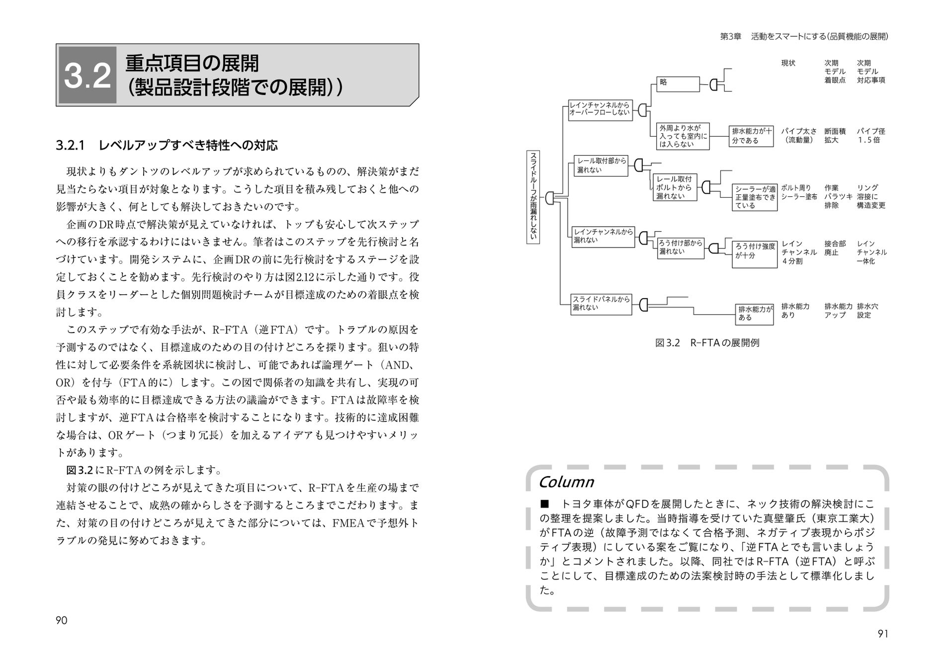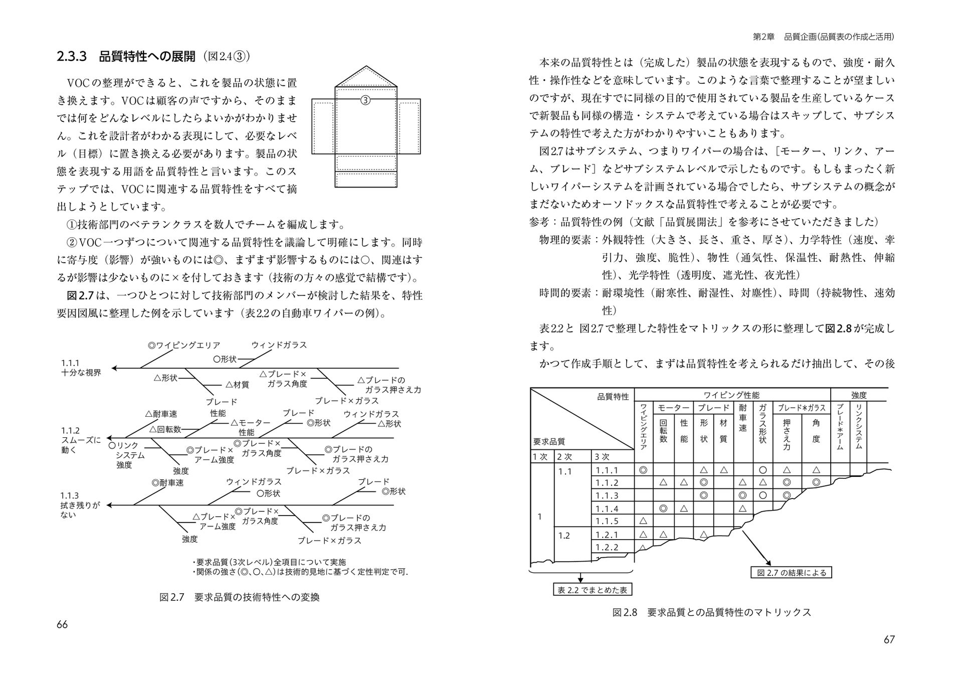 従来は十数枚にも及ぶ展開を、わずか2枚の品質表と1枚の系統図(R-FTA)で処理するよう簡素化した体系を披露するほか、要求品質のウエイト付け方法の変更についても指南しています。米国でfukuhara methodと称され、MITの教科書にも採用された思考と手法をわかりやすく伝えます。