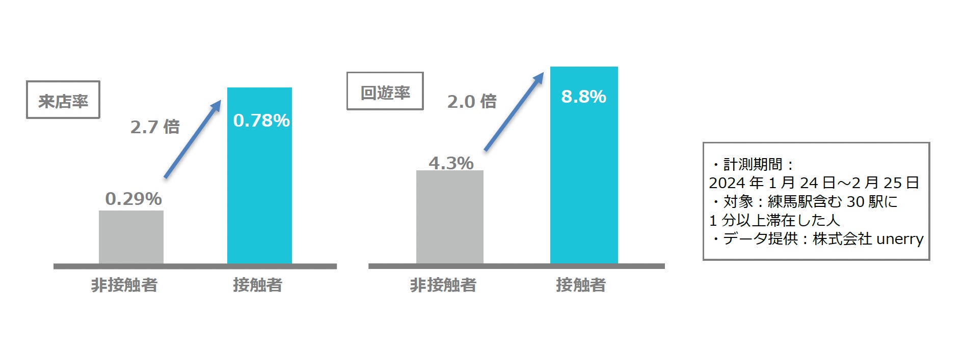検証の結果、駅構内のデジタルサイネージ広告接触者の対象店舗来店率は0.78%で、非接触者(0.29%)と比較すると、2.7倍の結果となりました。また、対象店舗の回遊率については接触者が8.8%、非接触者が4.3%となり接触者の回遊率が2倍という結果でした。