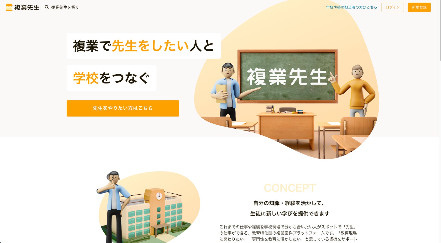 これまでの仕事や経験を学校現場で分かち合いたい人がスポットで「先生」の仕事ができる、教育特化型の複業案件プラットフォームです。キャリア教育の講師、探究学習のアドバイザー、国際理解教育講師、外国語/グローバル教育支援、金融教育、ICT支援など、教員経験がなくても人それぞれの形で学校を支援することができます。現在、国内外に約1,500名の複業先生が登録しており、これまで約300学校へ外部人材による授業を提供してきました。