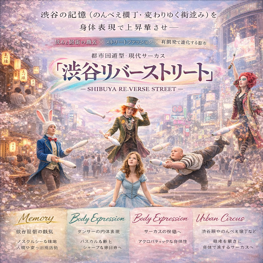 渋谷の「雑多さ」をアクロバットやジャグリングで表現し、童話をオマージュした短編演目を開発。渋谷に眠る歴史や文化を演出に組み込み、「鑑賞する場」から「物語を体感する場」へと塗り替える、非言語の没入型現代サーカスショーを創出します。