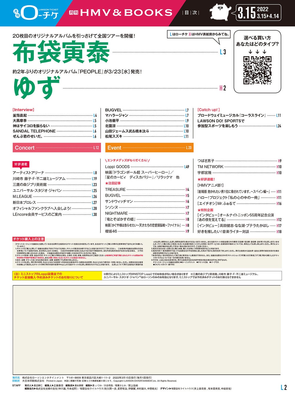 月刊ローチケの表紙には、ニューアルバム『Still Dreaminʼ』を携え5月から全国ホールツアーをスタートする「布袋寅泰」。そして、月刊HMV&BOOKSの表紙には、約2年ぶり通算16枚目のオリジナルアルバム『PEOPLE』を3月23日(水)にリリースする「ゆず」が登場!