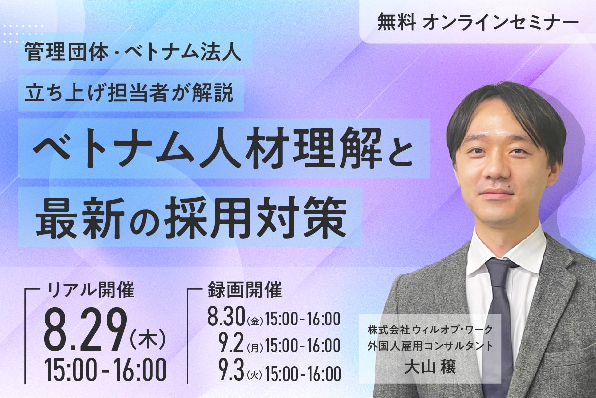 ウィルグループの総合人材サービスを手掛ける株式会社ウィルオブ・ワーク(本社:東京都新宿区、代表取締役社長:村上 秀夫)は、無料オンラインセミナー『【監理団体・ベトナム法人立ち上げ担当者が解説】~ベトナム人材理解と最新の採用対策とは!?~』を、2024年8月29日(木)に開催します。