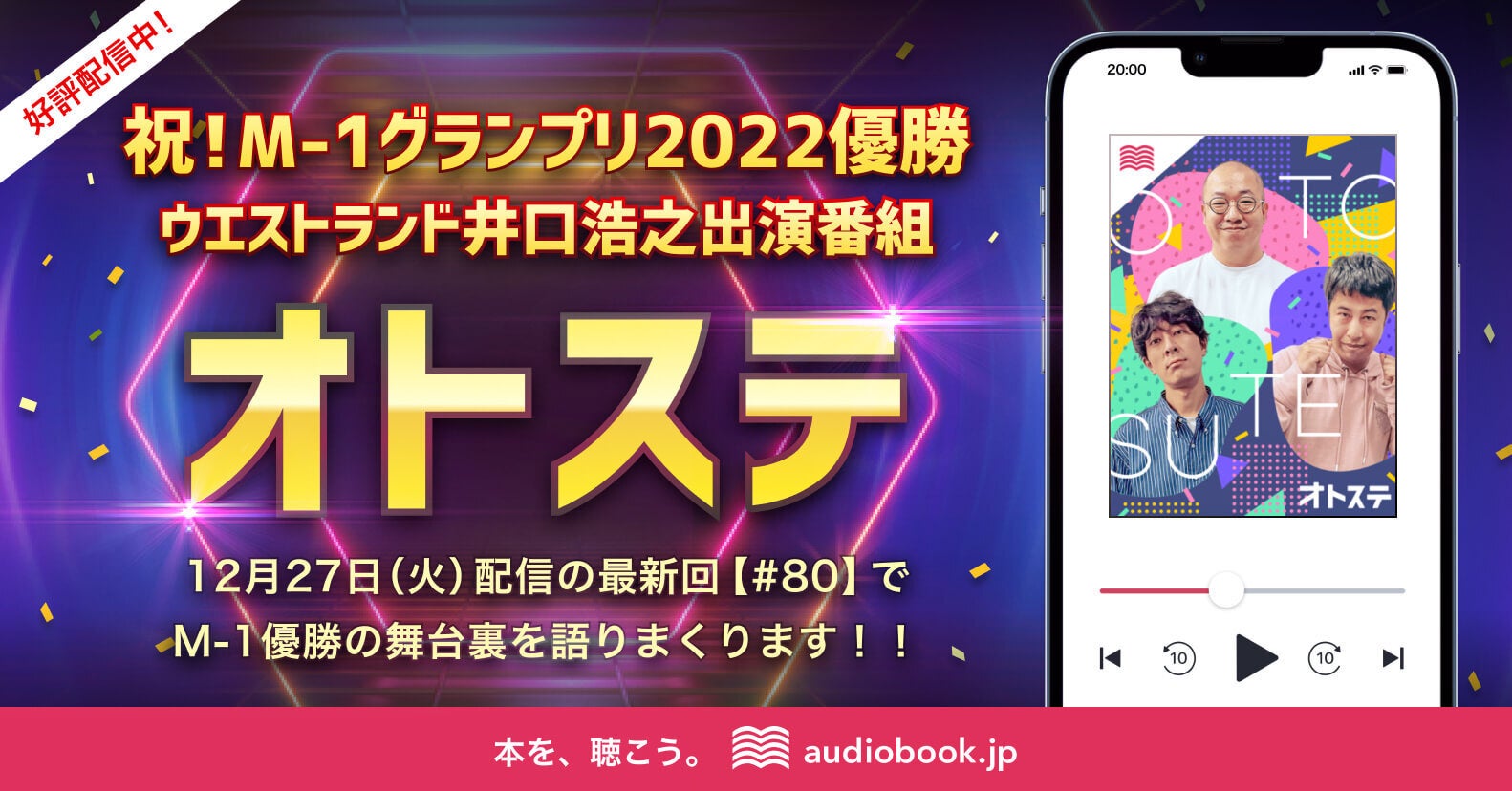 優勝後初の収録となる12月27日(火)配信の最新回【#80】では、勝利の興奮冷めやらぬウエストランド井口さんにM-1優勝の舞台裏をたっぷりと語っていただきました。実は1年前の配信回でM-1決勝進出ネタができたと明言していたなど、『オトステ』でしか聞けない話が盛りだくさんとなっています。「audiobook.jp」、Apple podcastなどでお楽しみください。