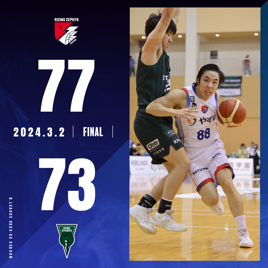2024年3月2日(土)に開催されました【ライジングゼファーフクオカvs.神戸ストークス】において“福岡77-73神戸”の結果となりましたことお知らせいたします。