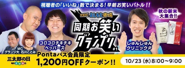 本グランプリは10月より毎月23日に予選が行われ、決勝大会は2025年3月に配信を予定しています。ネタバトルの勝者は番組内の“いいね数”で決定する視聴者参加型の配信となり、優勝者には、「生配信!よしもと市場」の冠番組の開始に加えて、勝者が本当に行きたいパワースポット巡りロケ(生配信!よしもと市場にて配信)を予定しています。1回戦目の対戦者は、キングオブコント2015の王者であるコロコロチキンペッパーズと医師と芸人の二刀流のしゅんしゅんクリニックPがライブTV限定オリジナルネタを披露します。賞レースチャンピオンのライブTV限定オリジナルネタは、乞うご期待です。