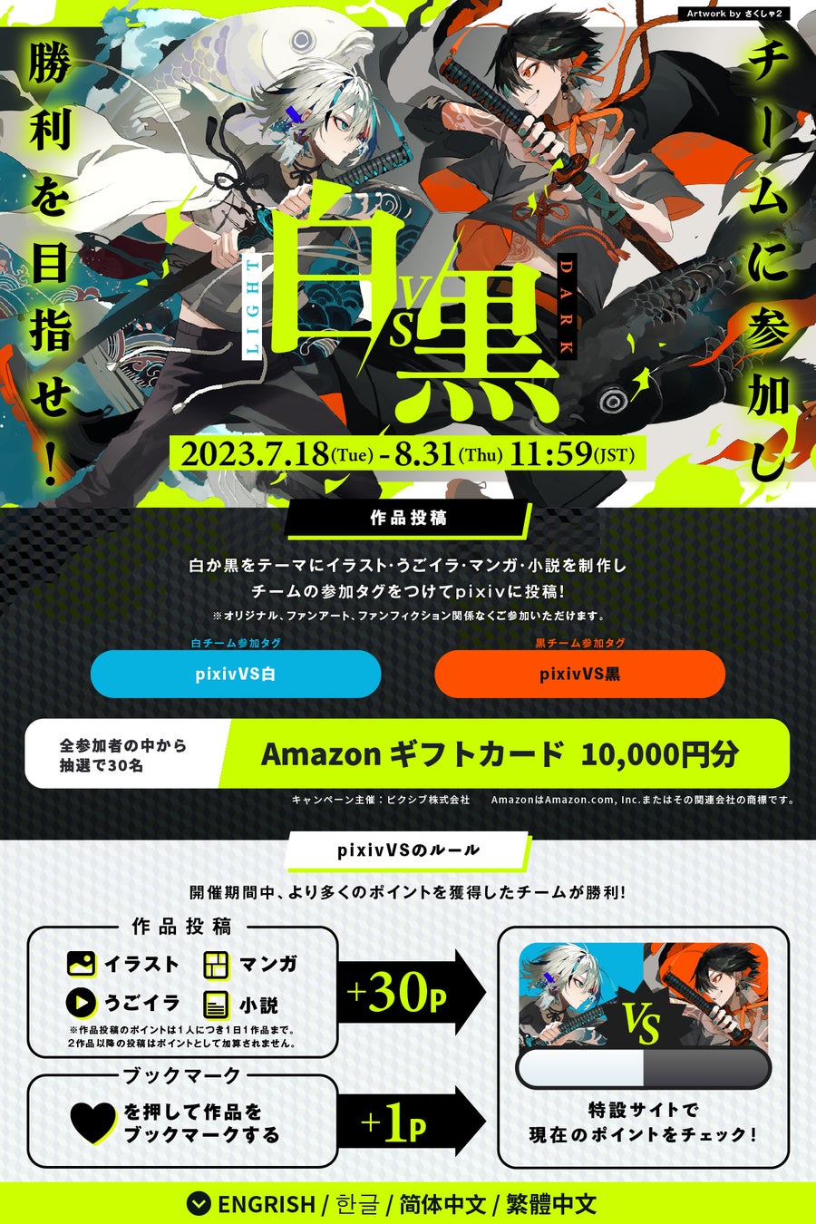 「pixiv VS」第1弾では、参加者が「白」「黒」いずれかのテーマで作品を制作します。開催期間中のpixivへの投稿作品数と各作品についたブックマーク数をポイントとして、より多くのポイントを獲得したほうが勝利となります。
