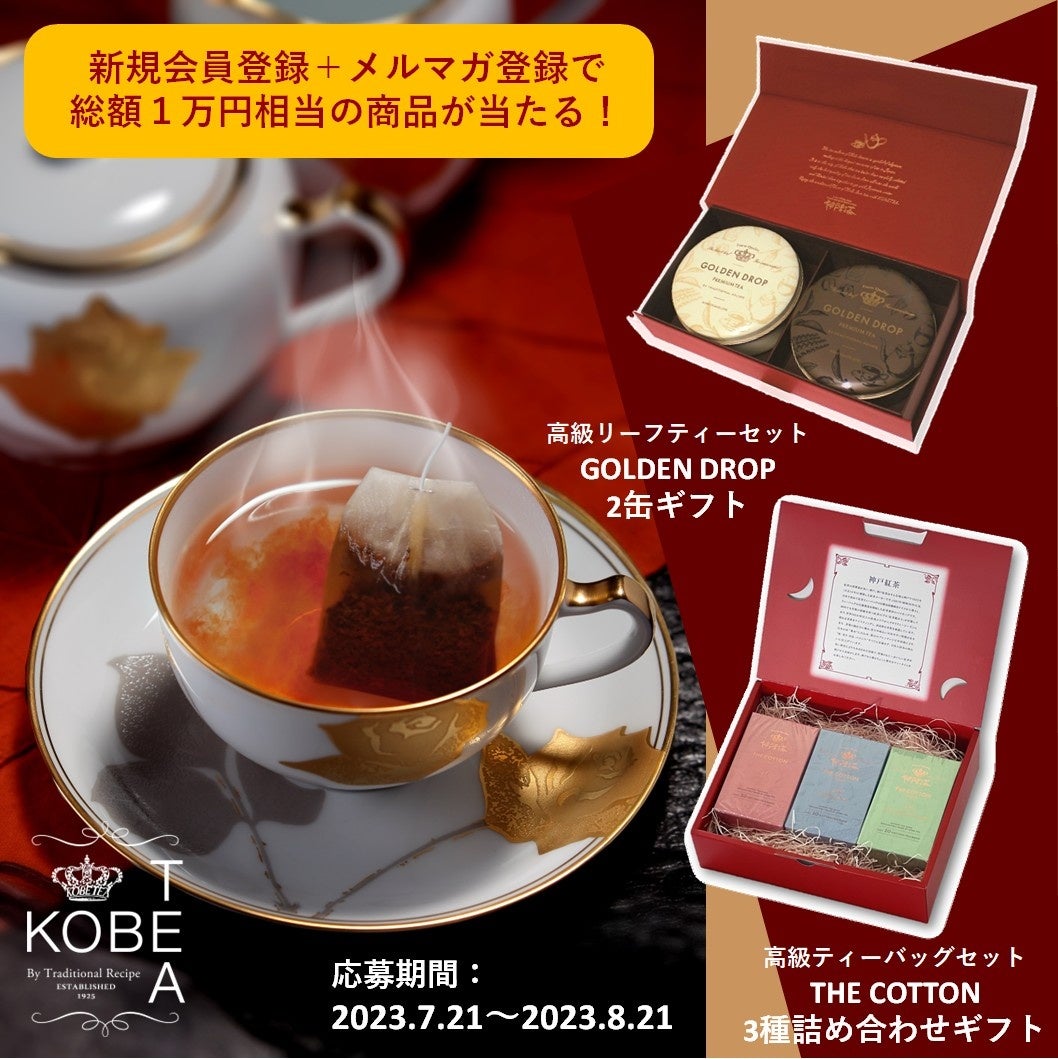 神戸紅茶メルマガ会員登録が1万人を突破したことを記念し、2023年7月21日(金)〜2023年8月21日(月)の期間中に、神戸紅茶オンラインショップにて新規会員登録およびメルマガ登録をいただいた方の中から抽選で5名の方に、神戸紅茶商品の最高級茶葉セット「GOLDEN DROP 2缶セット」と高級ティーバッグシリーズ「THE COTTON3種類詰め合わせギフト」のセット(総額1万円相当)が当たる豪華プレゼントキャンペーンを実施します。