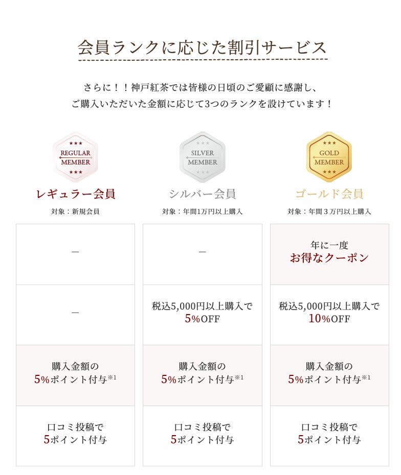 さらに神戸紅茶では皆様の日頃のご愛顧に感謝し、お買い上げ金額に応じて3つのランクを設けています。