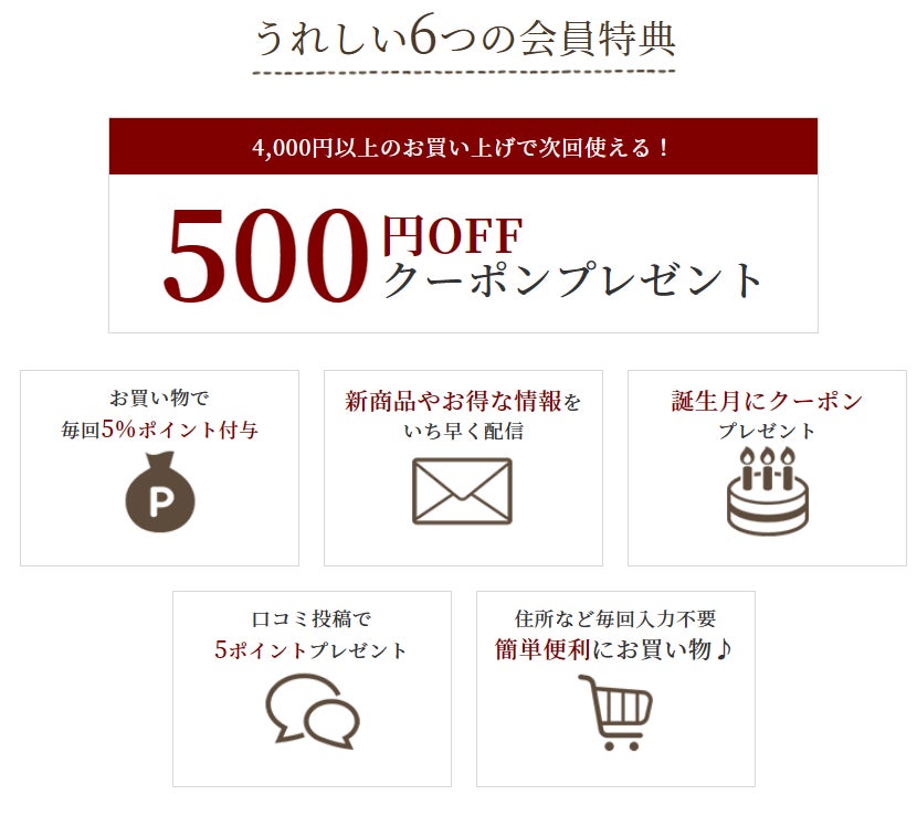 会員登録ですぐに使えるクーポンを配布しています。会員登録後に送られてくるメールにクーポンを記載していますので、ぜひご購入の際は使ってみてください。