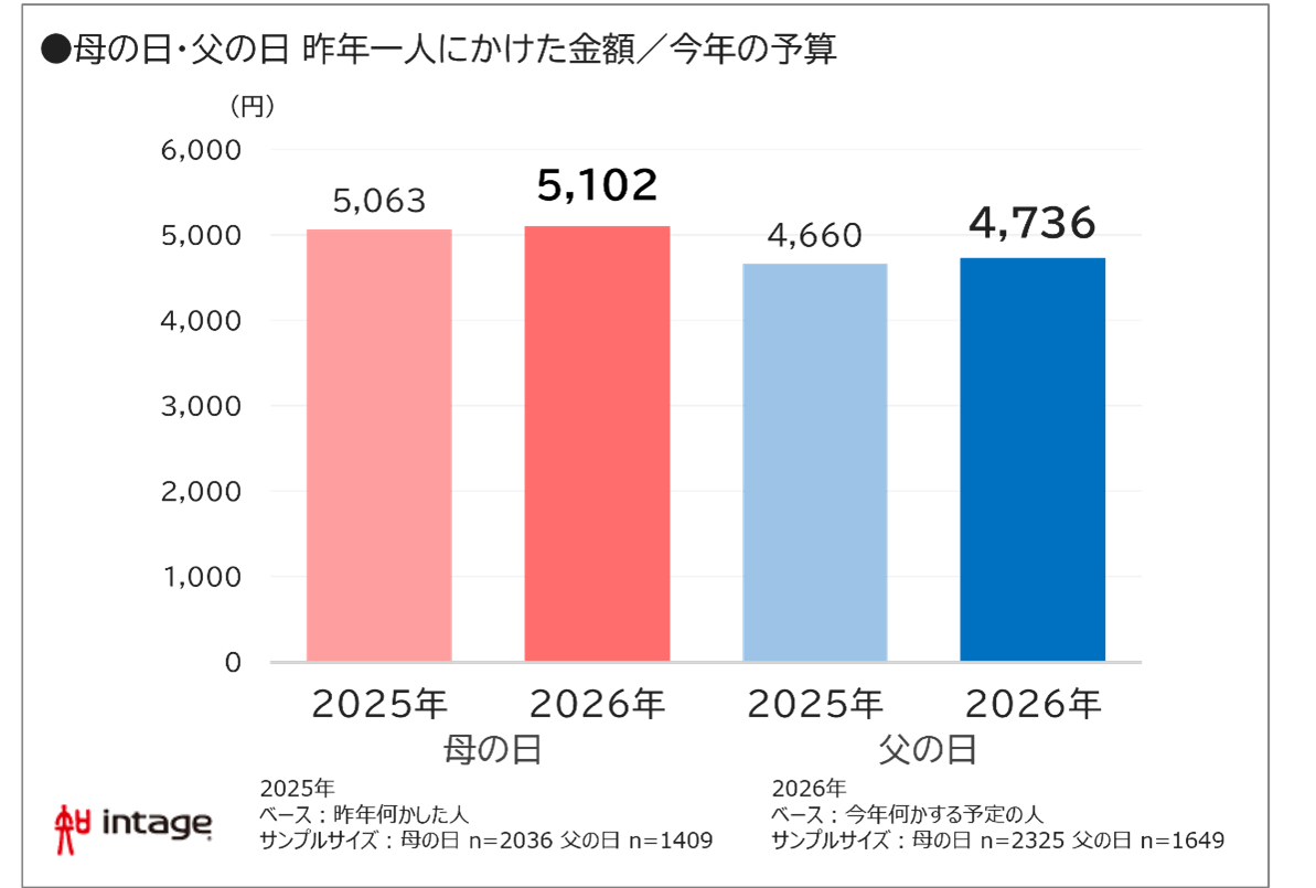意向差が鮮明。実施率・予算とも母の日が上回り、母の日5,102円、父の日4,736円