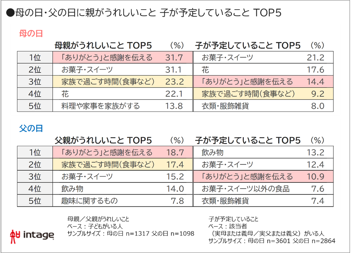 ・子のプレゼント1位は、母へ「スイーツ」、父へ「飲み物」に対して、親としては「感謝の言葉」が一番うれしい