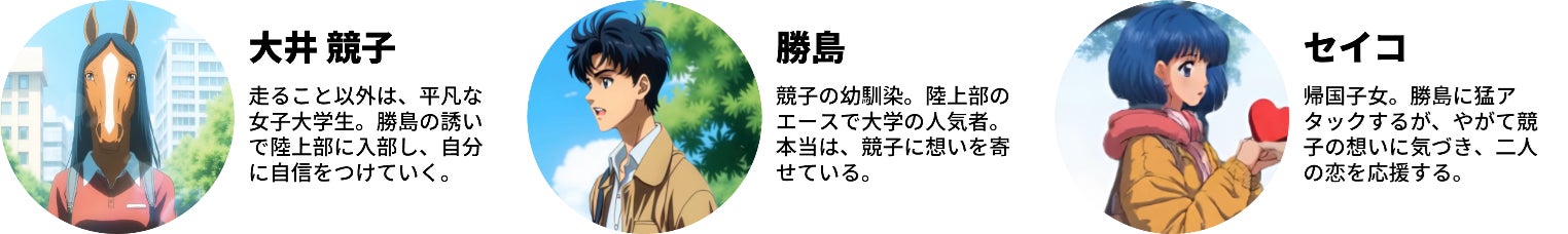 主人公・大井競子は、夢の舞台「東京ダービー」を目指して奮闘する、走ることが大好きな女子大学生。競子が密かに恋心を抱き、彼女のコーチも務める幼馴染の勝島。よき友人であり、恋のライバルでもあるセイコ。3人が繰り広げる青春物語を、アニメ番組の予告編風に仕立てました。