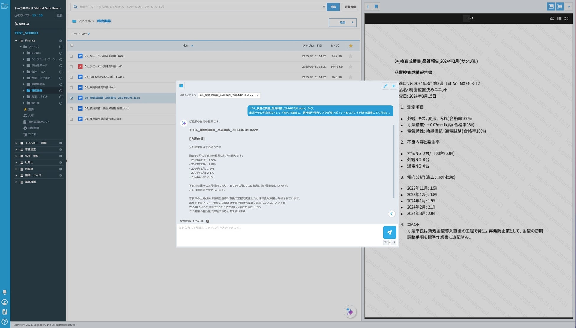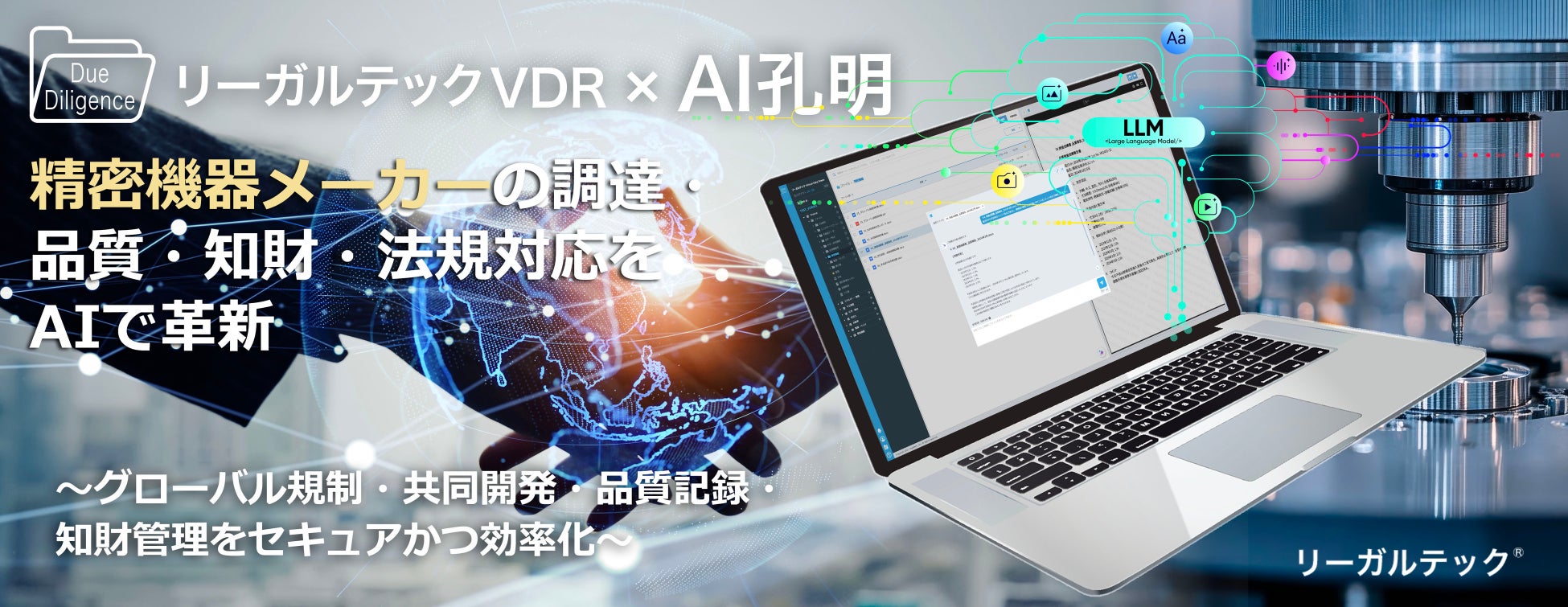 2025年6月26日 リーガルテック株式会社(本社:東京都、代表取締役:佐々木 隆仁)は、精密機器業界向けに最適化したバーチャルデータルーム(VDR)「リーガルテックVDR」に、当社独自の生成AI「AI孔明」を統合した新機能をリリースしました。