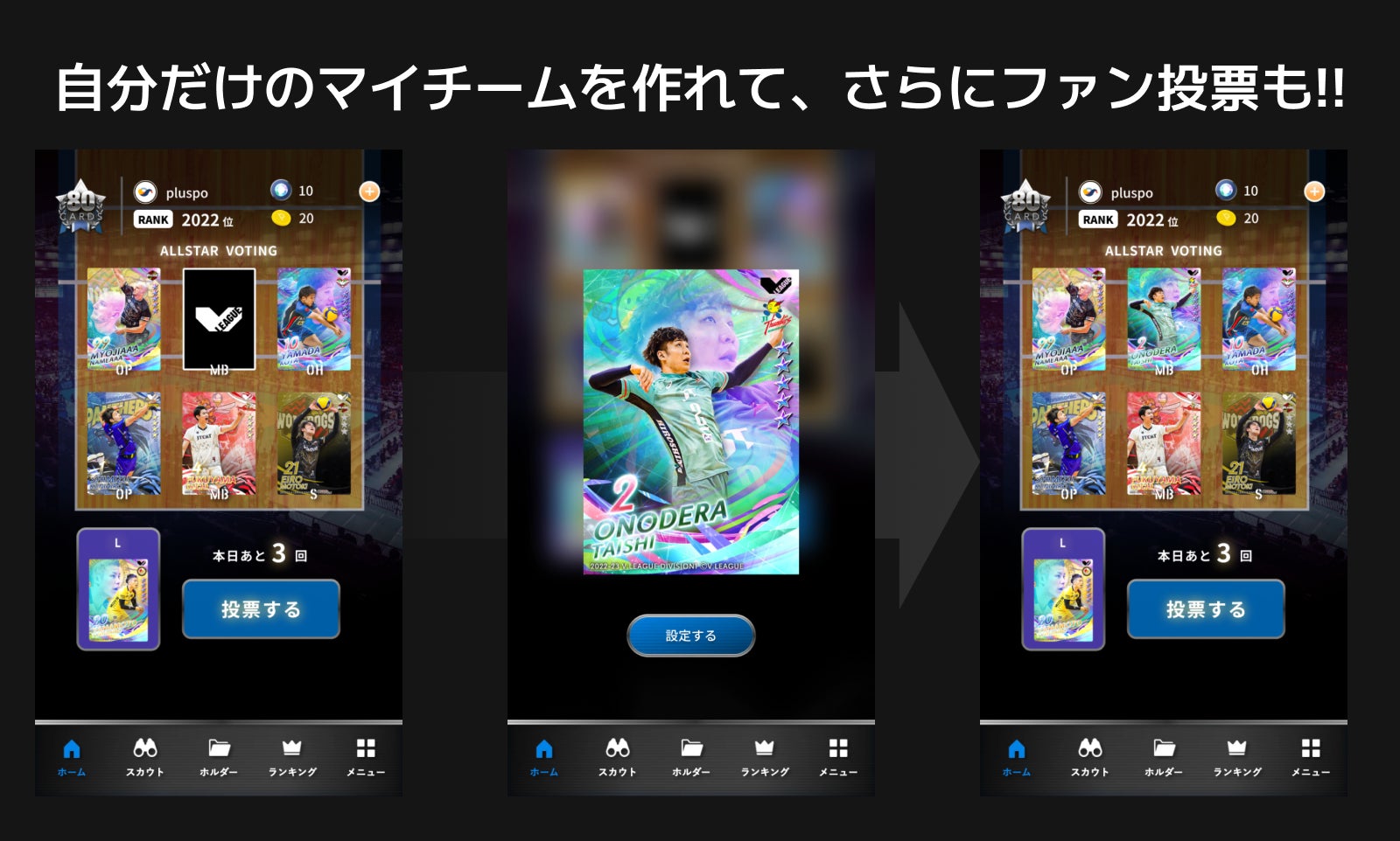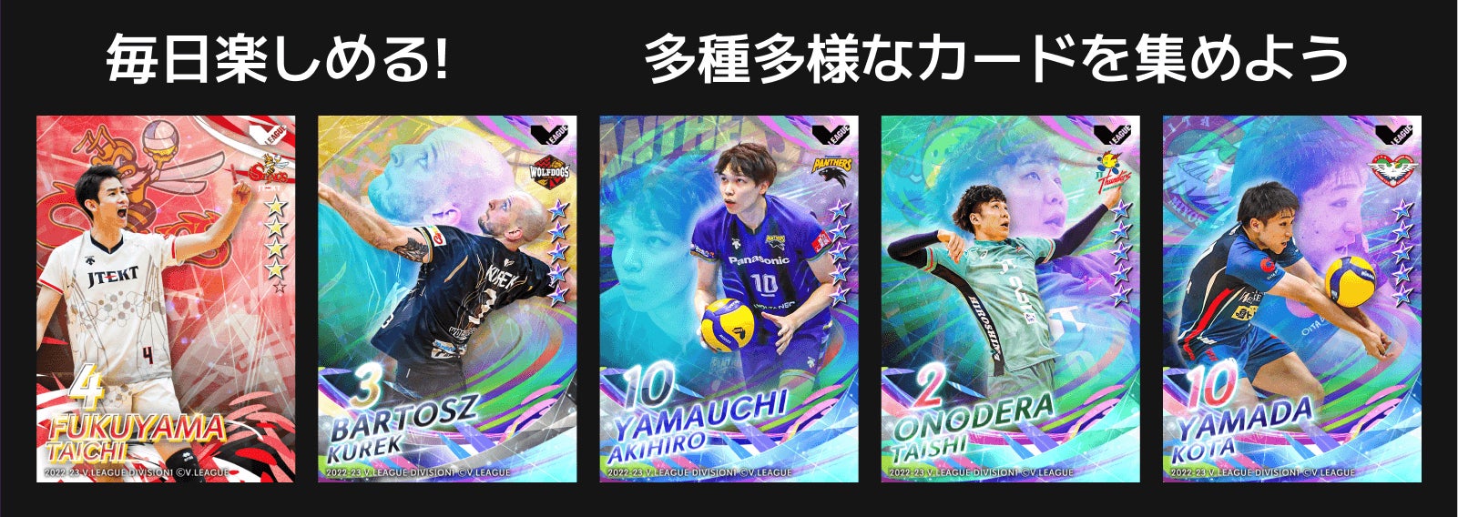 Vリーグでの白熱した試合の様子を、各選手ごとのデジタルカードとしてお届けいたします。レア度に応じて趣向を凝らしたデザインで制作された選手カードを収集しながら、数々のミッションをクリアし、ファン同士でランキングを競い合う、バレーボールファンが毎日楽しめるサービスを提供いたします。Vリーグでのプレーシーンを中心に、選手のオフショット企画等、様々な素材を使った幅広いデジタルカード展開を予定しております。