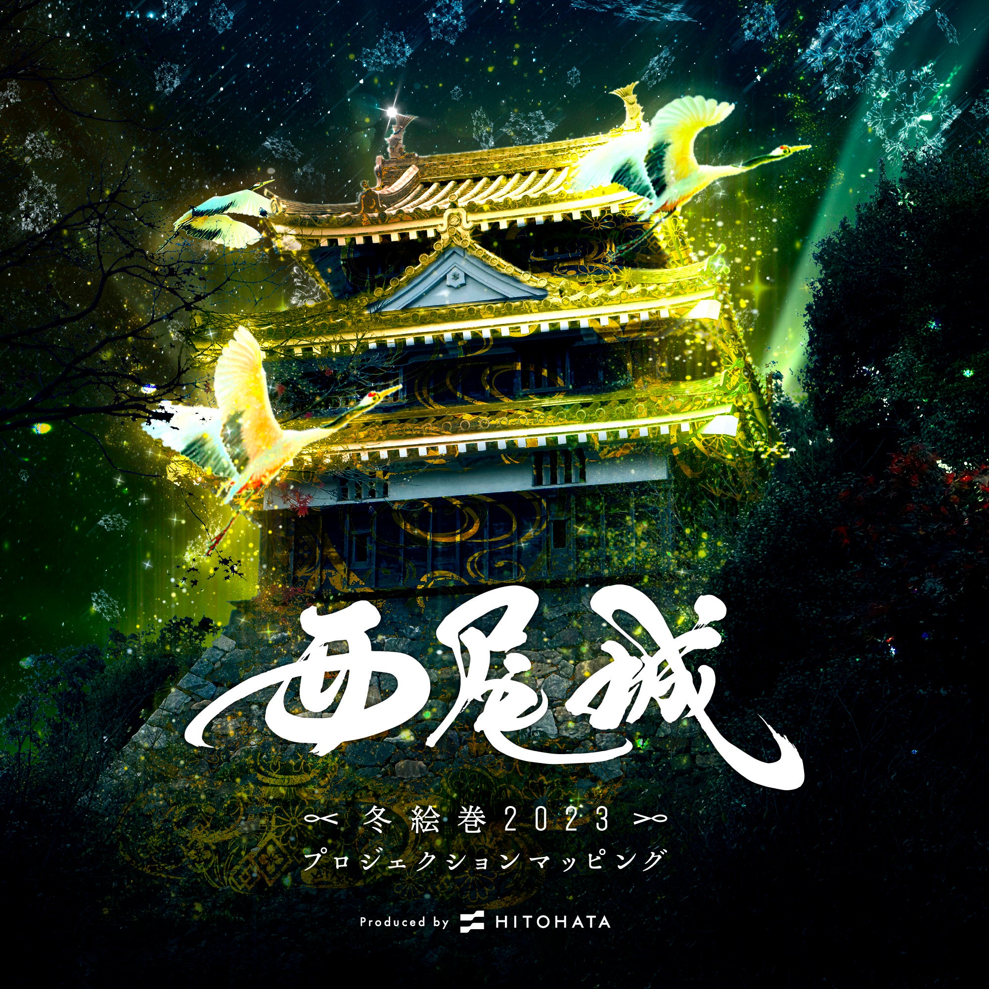 西尾市のシンボル・西尾市歴史公園で初めてのプロジェクションマッピングを行います。徳川家康から「鶴城」を命名されたと言われる西尾城にちなみ、鶴や徳川家康ゆかりのモチーフ、西尾市ならではの歴史や文化をテーマにした迫力あるデジタルアニメーションを本丸丑寅櫓や鍮石門、旧近衛邸の庭園に投影します。