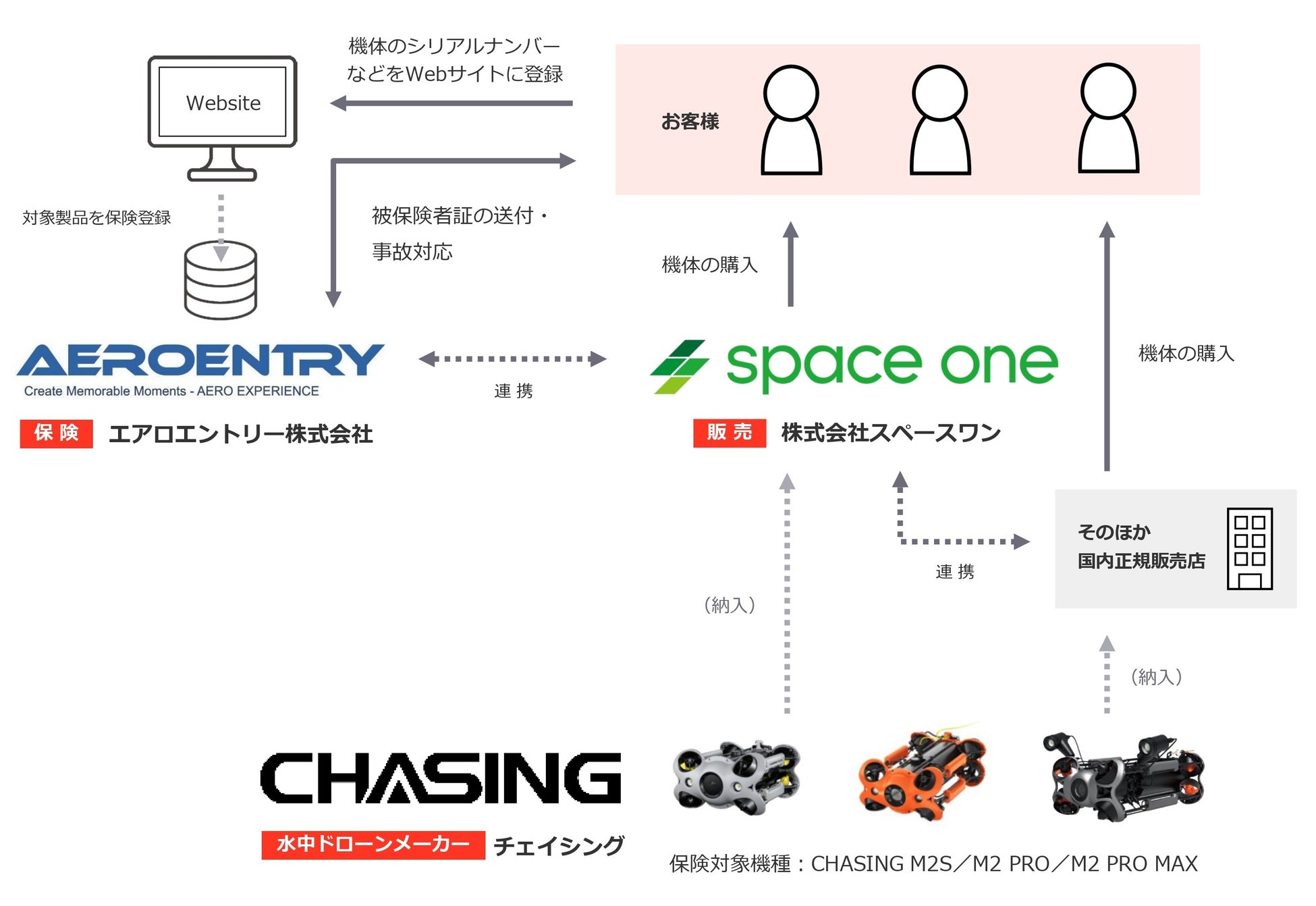 近年、空のドローンに続いて水中ドローンの普及が加速しています。特に、水中ドローンメーカー大手・CHASING社製品はその性能と手ごろな価格から国内で高い人気を誇っており、広く普及しています。一方で空のドローン同様、ユーザーからは安心して使用できる保険サービスへの要望が多く寄せられていました。このニーズに応えるため、株式会社スペースワンとエアロエントリー株式会社は水中ドローンの無償付帯賠償責任保険に関する業務提携を結び、本サービスの提供を決定いたしました。