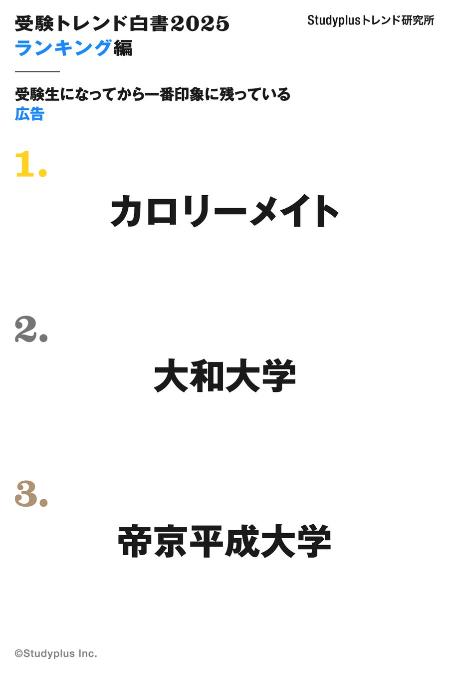 「カロリーメイト」が最も多くの票を集めました。「狭い広い世界で篇」「それぞれの音色篇」「光も影も篇」など好きなCMまで記載してくれている回答が多く見られました。受験生を応援するCMやプロモーションが心を掴んでいるようです。「大和大学」と「帝京平成大学」も昨年に続いてのランクインとなりました。
