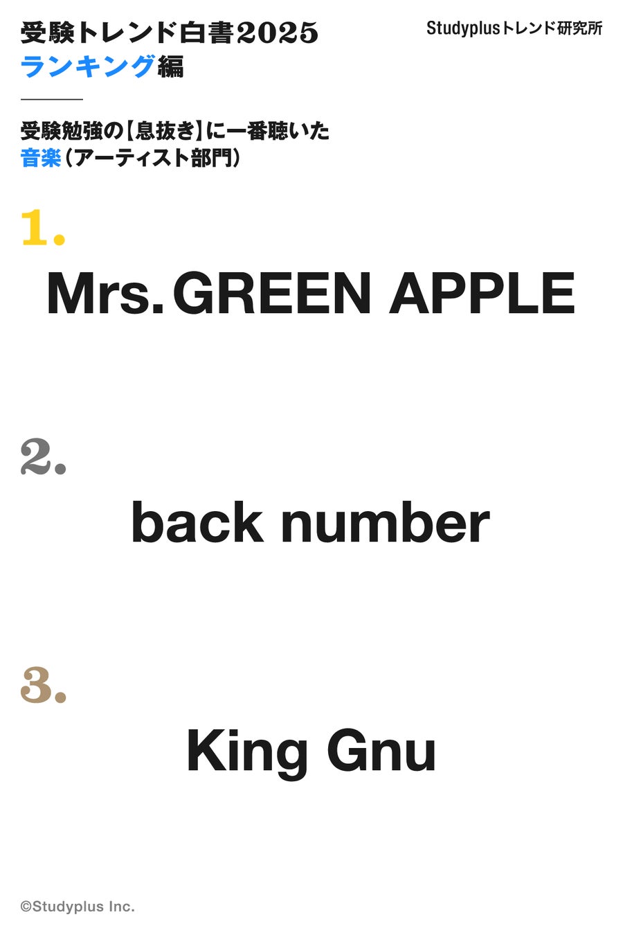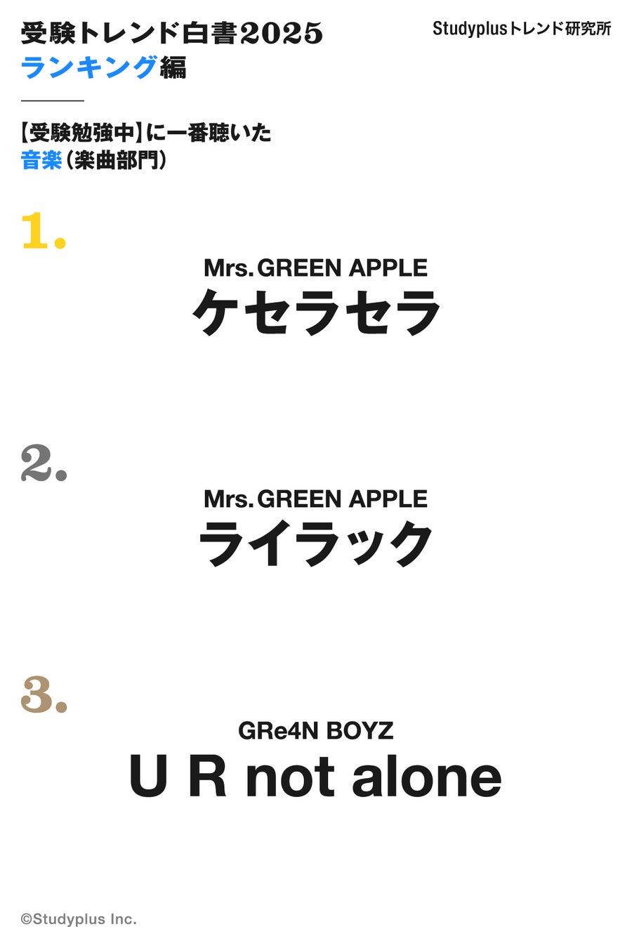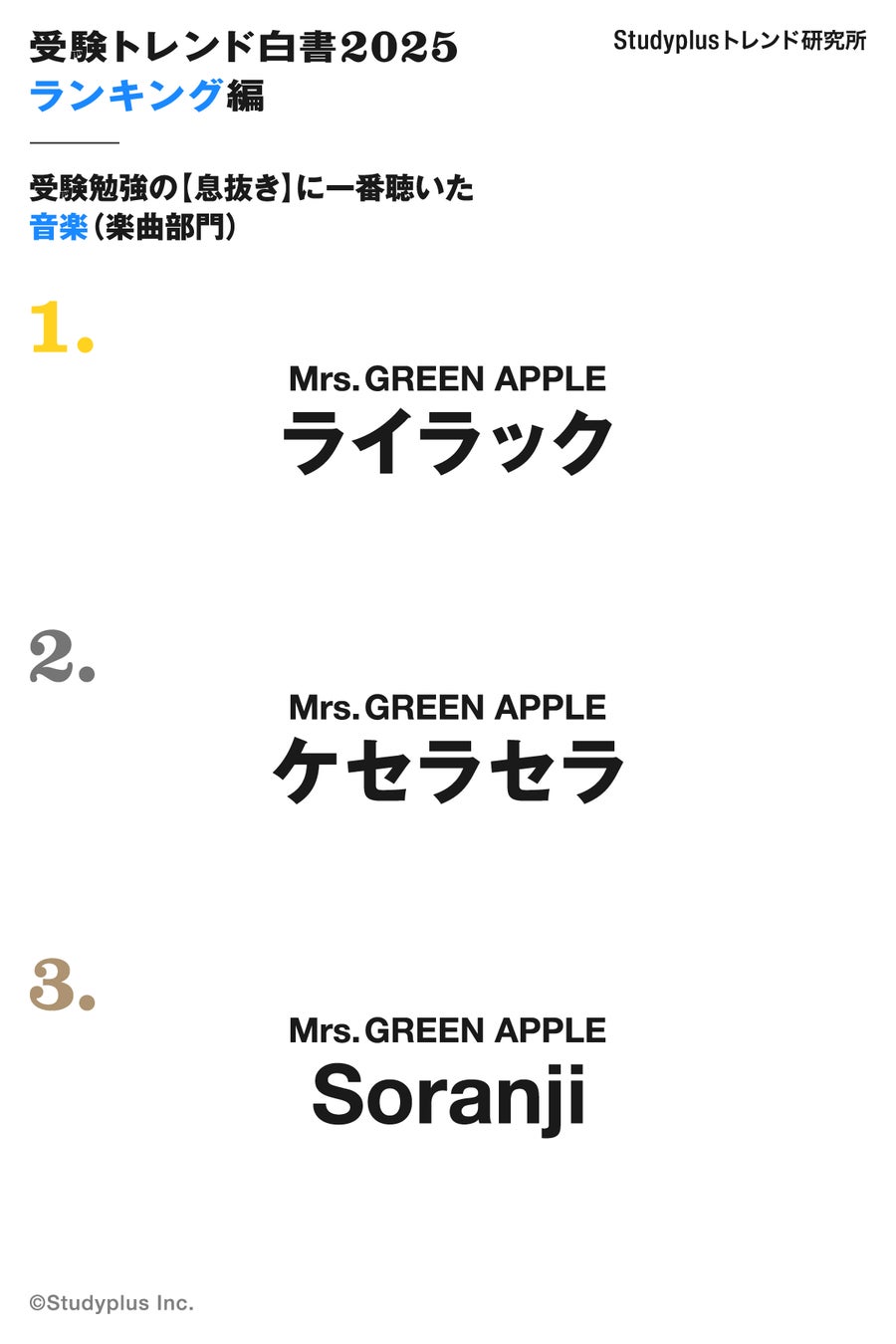 受験勉強の息抜きに聞いた音楽「Mrs. GREEN APPLE」が1位〜3位を独占~「受験トレンド白書2025 “ランキング編”」を発表~