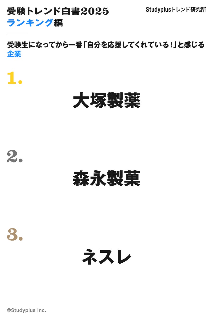 続いて支持を集めたのは「森永製菓」「ネスレ」。「森永製菓」はTVCMだけでなく、広告などにも力を入れていて、受験生の定番アイテム「赤シート」を使った駅の広告など、応援プロジェクトが受験生にも伝わっているようです。「ネスレ」は「キットカット」が受験生を応援する商品として長く愛されています。
