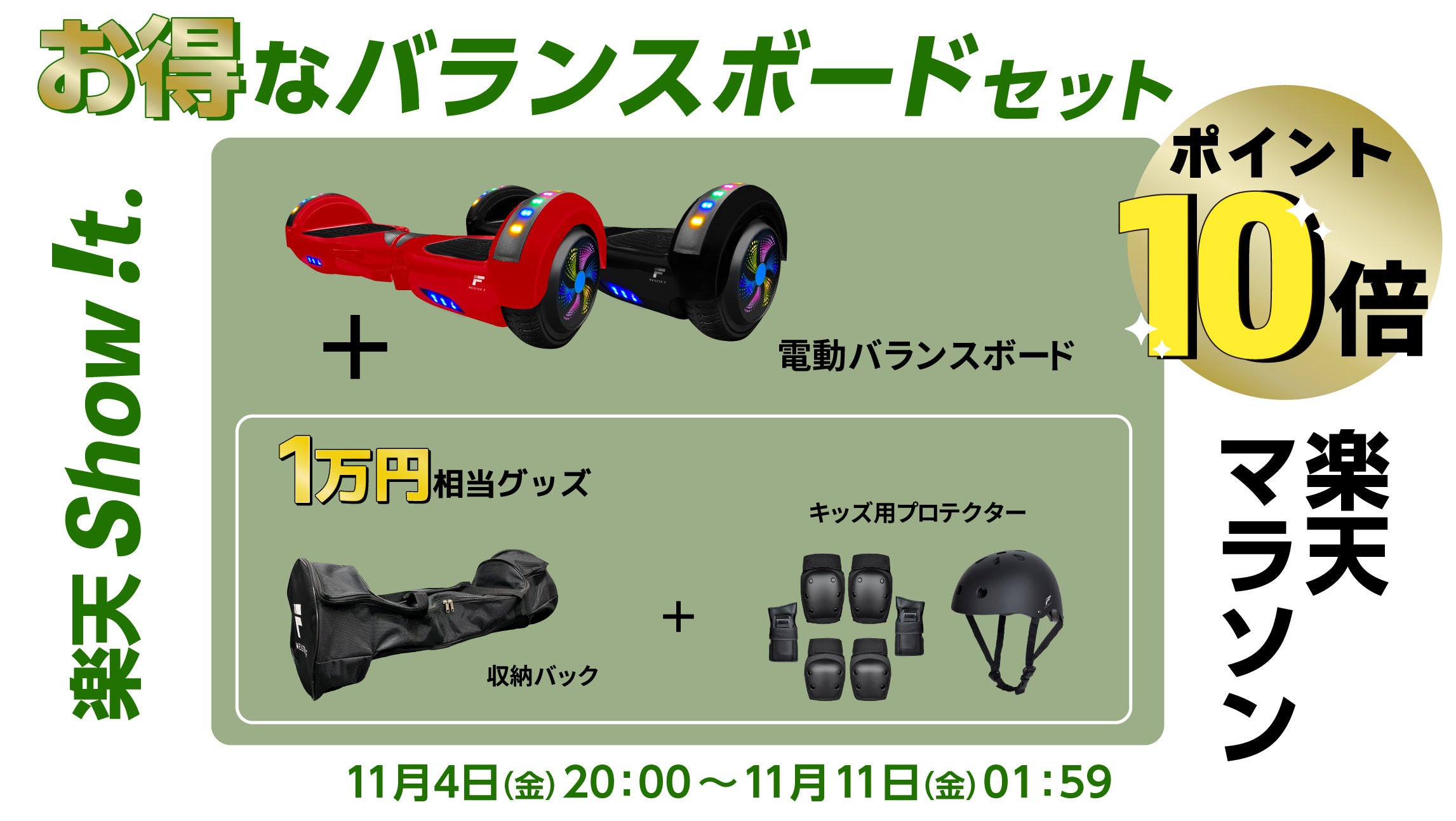 楽天市場「Show !t」11月4日(金)20時から、電動バランスボード購入で10,000円相当のキッズプロテクターと収納バックのプレゼントキャンペーンを開催。ポイント10倍楽天お買い物マラソンに参加