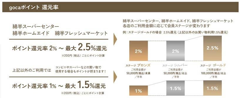 貯まる、貯まる、ドンドン貯まる! 綿半グループ(綿半スーパーセンター・綿半ホームエイド・綿半フレッシュマーケット)利用時の還元率は 最大2.5%。綿半グループ以外の利用でも最大1.5%の高還元。