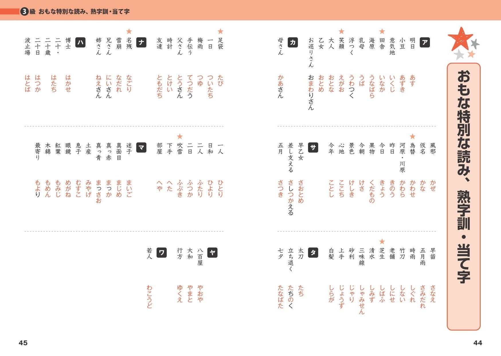 別冊付録の「でる順用例付き漢字表」には、でる順用例付きの「配当漢字表」や、「おもな特別な読み、熟字訓・当て字」などを収録しています。視覚的にも記憶に残りやすい工夫を施しました。