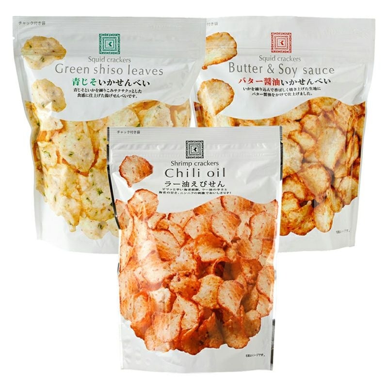 大人気、ラー油えびせんの他、青じその爽やかな香りといかの旨みが口いっぱいに広がる「青じそいかせんべい」と、いかとバター醤油の絶妙な組み合わせが味わえる「バター醤油いかせんべい」