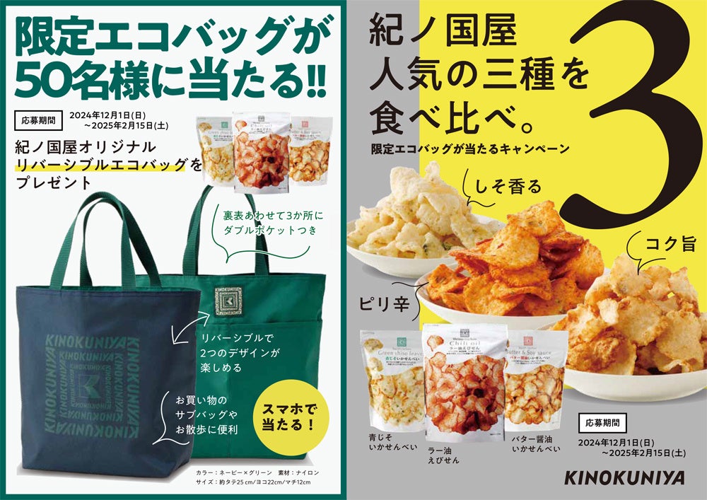 株式会社紀ノ國屋は、2024年12月1日 (日)から2025年2月15日(土)までの期間、「ラー油えびせん・いかせん食べ比べセット」をご購入いただいたお客さまを対象にした「紀ノ国屋人気の三種を食べ比べ(限定エコバッグが当たる)キャンペーン」を開催中です。