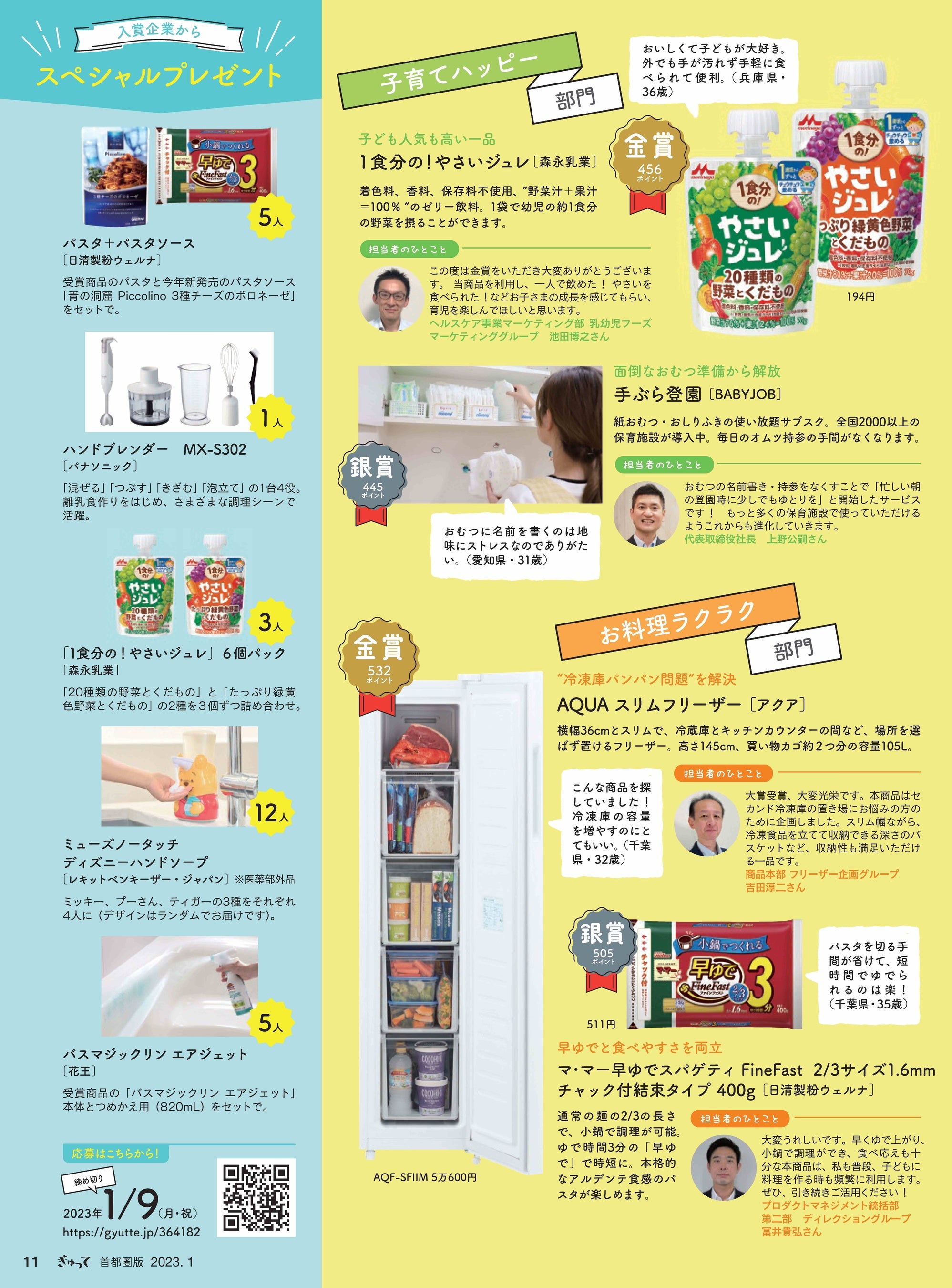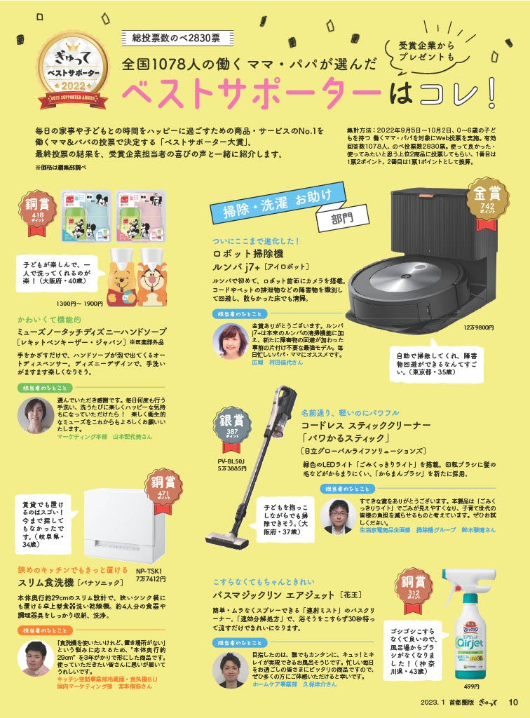 2022年度は、【お料理ラクラク部門】…「AQUA スリムフリーザー(アクア)」、【掃除・洗濯 お助け部門】…「ロボット掃除機ルンバ j7+(アイロボット)」、【子育てハッピー部門】…「1食分の!やさいジュレ(森永乳業)」が受賞。