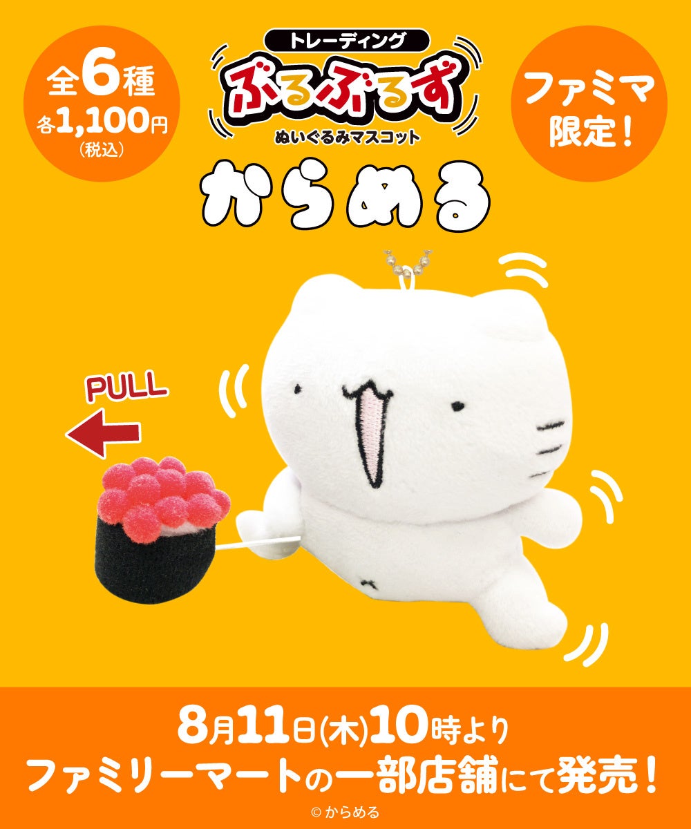 「からめる」から、人気ぬいぐるみシリーズ“ぶるぶるず"が登場!かわいい描き下ろしデザインの「ぶるぶるず ぬいぐるみマスコット」がファミリーマートの一部店舗で限定発売!お寿司モチーフを引っ張ると、ブルブルと可愛く震えるぬいぐるみです!