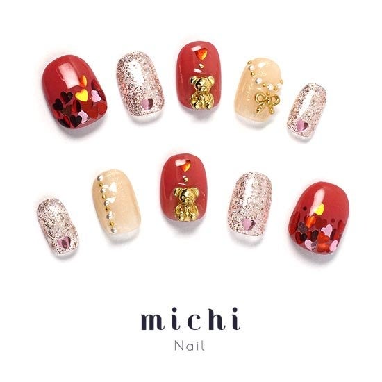 金色のくまさんとリボンが目を惹くガーリーネイル。ピンクのラメや赤いハートなどとにかく可愛いデザインです。デートやイベントなど、ここぞというときに持っておきたいネイルチップです。
