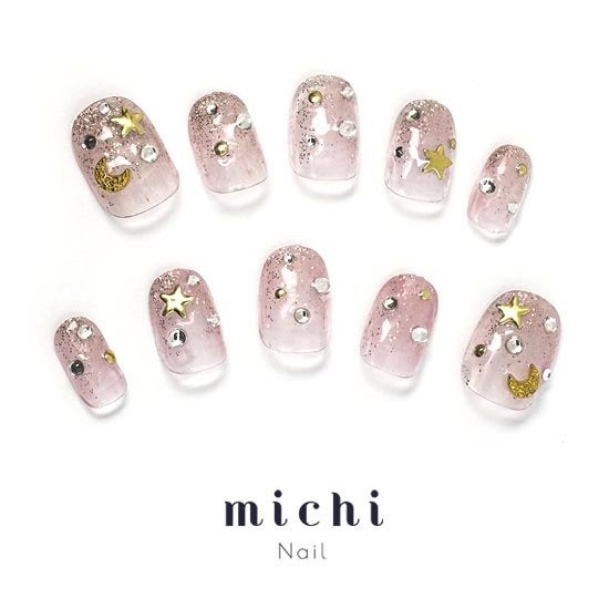 ピンクのベースにシャンパンゴールドのラメで宇宙っぽさがあるギャラクシーネイル。ゴールドの星と月がベースのピンクの組み合わせがとってもキュートです。ベースカラーに透明感があるので、肌になじみやすいアイテムです。