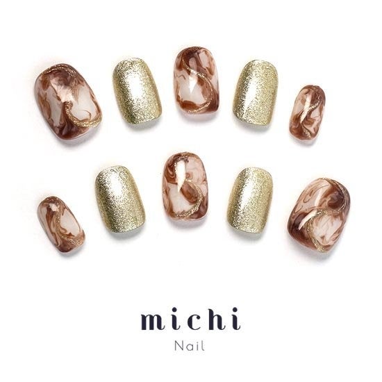パッ目を惹くゴールドとカフェラテのようなニュアンスアートがおしゃれなこちらのネイル。季節問わず使えるデザインなので、長く楽しめるデザインです。