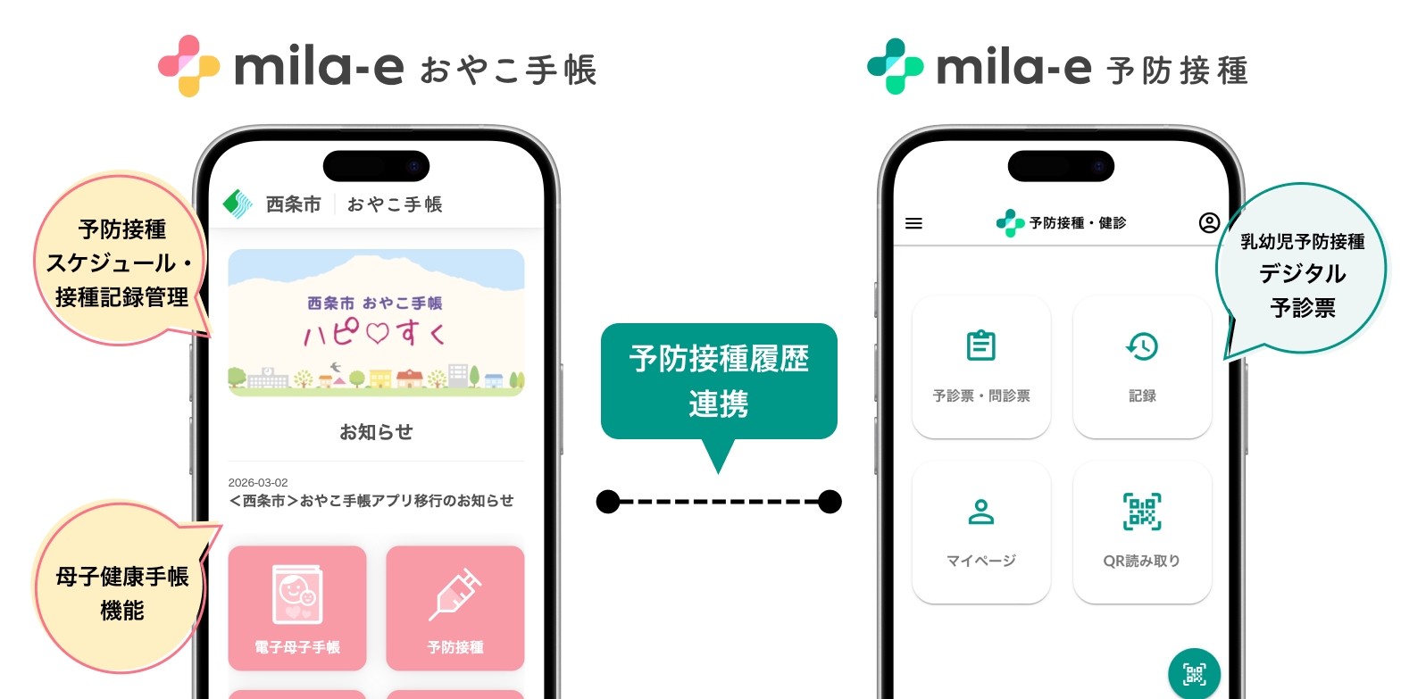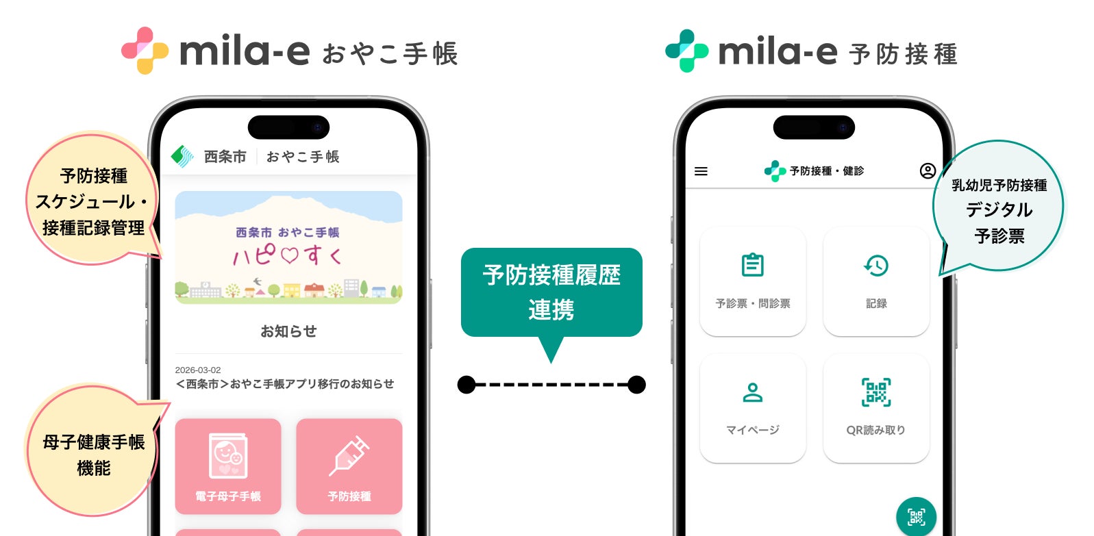 愛媛県 西条市では、2018年よりミラボが開発・提供する母子手帳アプリをベースとした「子育て応援サイト ハピ♡すく」、2024年より乳幼児予防接種デジタル予診票サービス「mila-e 予防接種」を一部の医療機関に導入し、長きに渡り子育て支援事業に取り組んでおります。