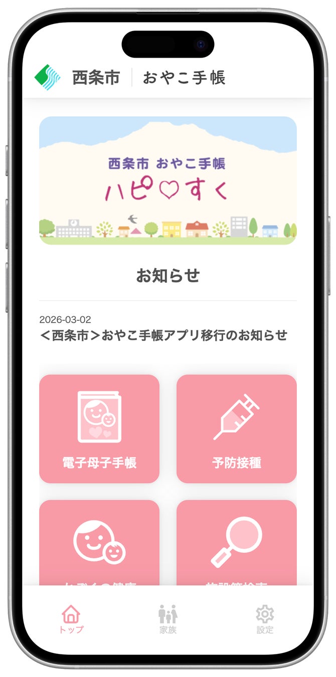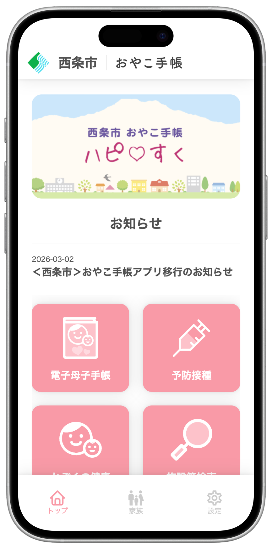 また 既存機能として、西条市からのお知らせを月齢・年齢にあわせてタイムリーに受信できる「メール配信・プッシュ通知機能」、予防接種漏れや接種間隔ミスを防ぐことができる「予防接種スケジューラー」、成長グラフや乳幼児健診の記録など母子手帳の内容をマイページに記録できる「電子母子健康手帳 機能」なども 引き続きご利用いただけます。