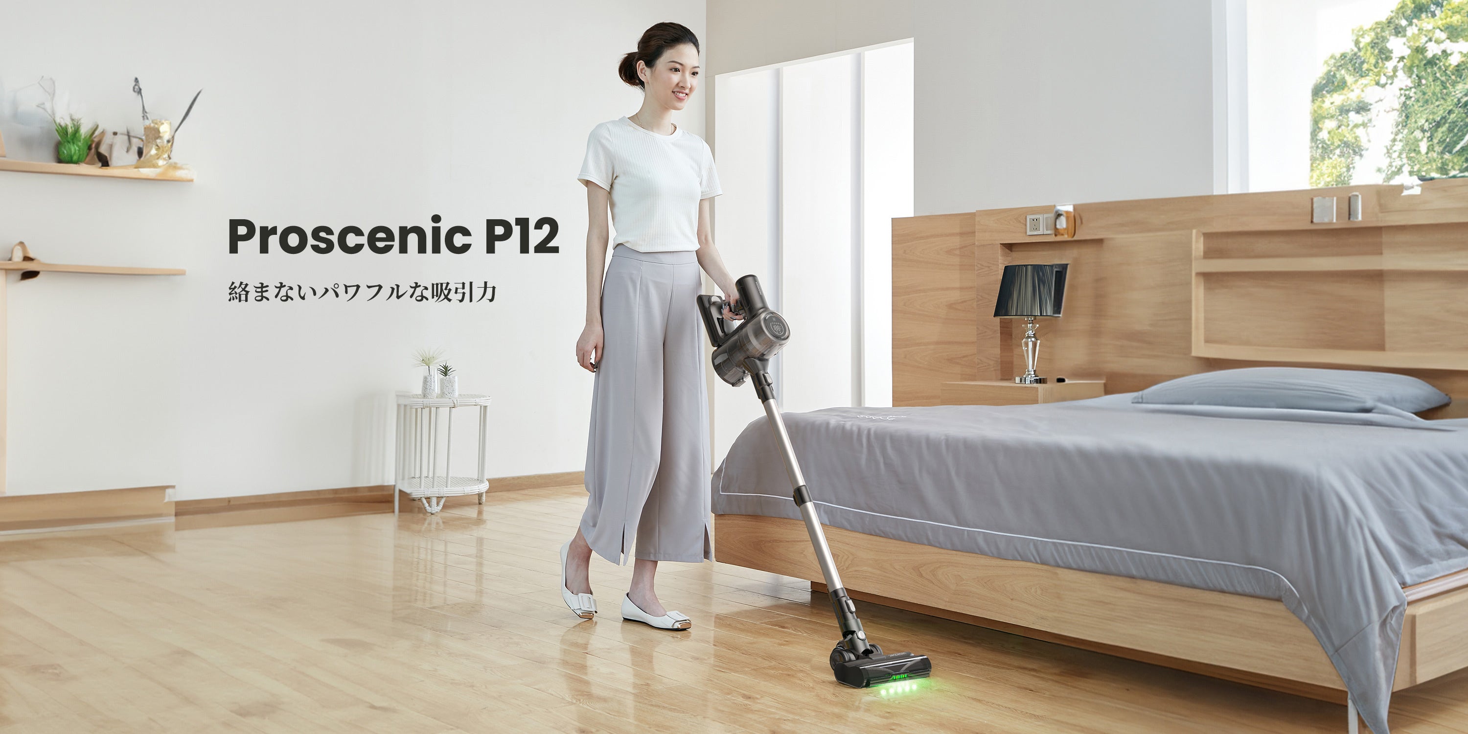 Proscenic P12は、最大吸引力約33000Paで、伸縮型パイプと絡まないブラシが優れた機動性を発揮。緑色LEDライトは、ベッドの下や家具の周りなど、見えにくい場所でもしっかりとお掃除できます。家族が快適にくつろぐリビングを実現します。