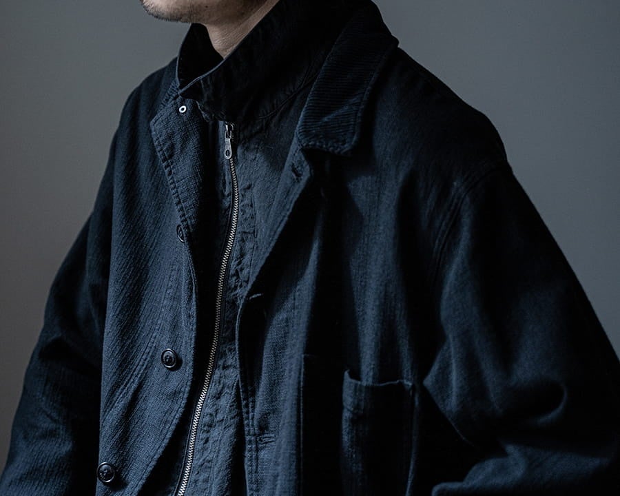 CONFECTが魅せられる生地の質感は、人工的に整えられた同一的な質感ではなく、自然が生み出す「ありのまま」が活かされた、よく見るとてんでばらばらな、不均一な質感です。私たちが天然素材、製品染めにこだわるのも、この「生地の質感」をより一層惹き出し、その上で服にしていきたいという考えあるからです。さらに不均一な質感は、着用者がどのように着て暮らすのかによって変化し、私たちが「味(=あじ)」として讃えるように、育っていく。そんな余白を持っています。2024年9月後半。「生地の質感」と「染め」に拘り、ワーク・ハンティングを由来とした新素材・新型のウェア2型をご用意しました。