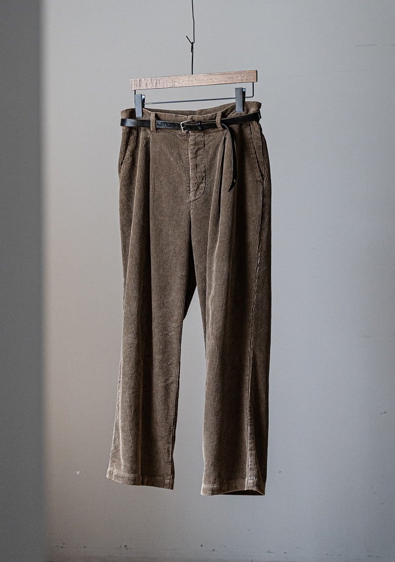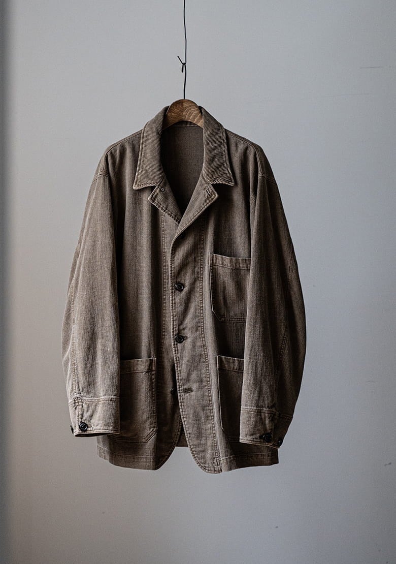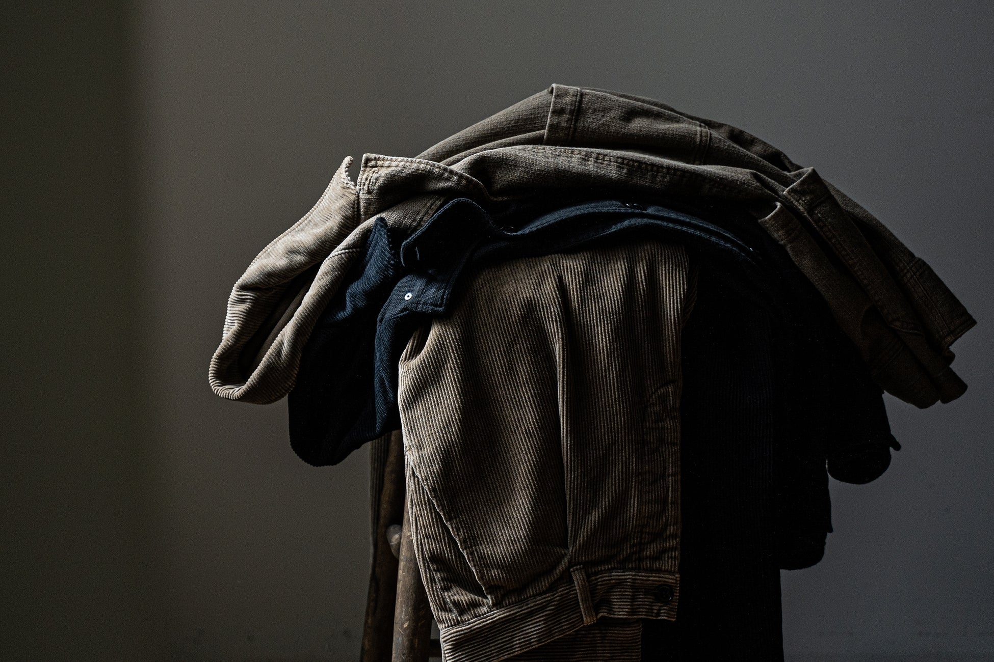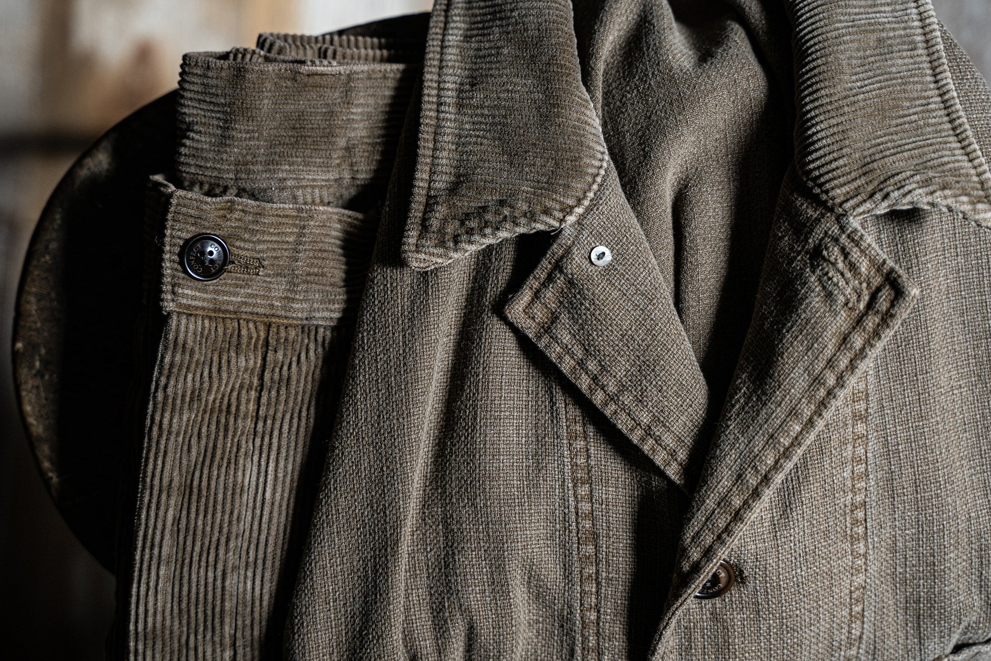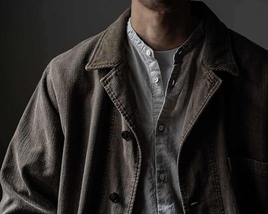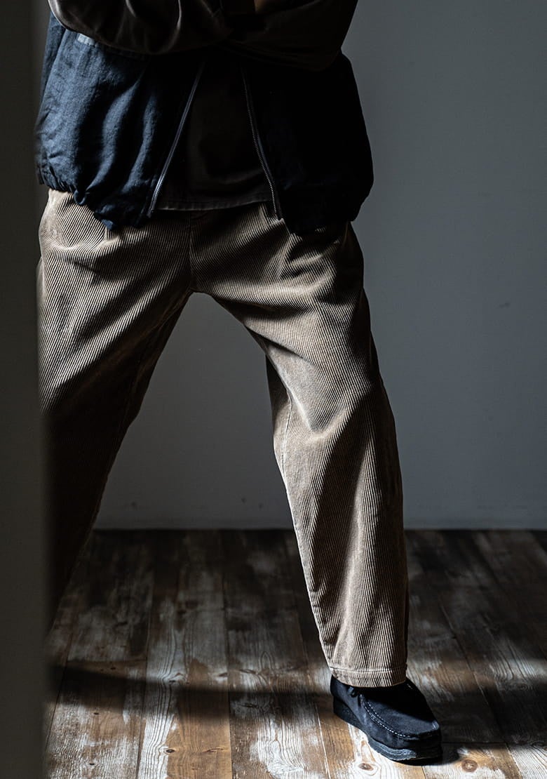 カバーオールジャケットのボディには、コットンリネンのプリペラ生地を採用しました。太番手の糸で構成された織り地は、表糸の浮き出しが強調されたもの。自然由来の素朴な質感が、生き生きと伝わってきます。衿には、コーデュロイを用いて、ジャケットを仕立てた後に製品染めを施しました。古典的なワークウェア・チョアジャケットと、ハンディングウェアの要素をミックス。ゆったりとしたサイジングで仕立てています。パンツも、ジャケットの衿と同じコーデュロイを採用。股上がやや深めであるため、ウエスト固定位置によってはノークションでも穿けるパンツです。染めは、敢えて色落ちのし易い顔料染めを施した後、予め色を落とす洗い加工を施しています。着古したヴィンテージのような、色濃淡やくったりとした生地に魅力が詰まっています。