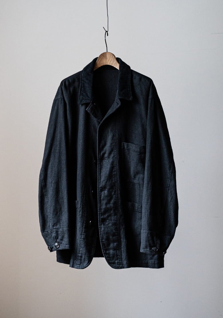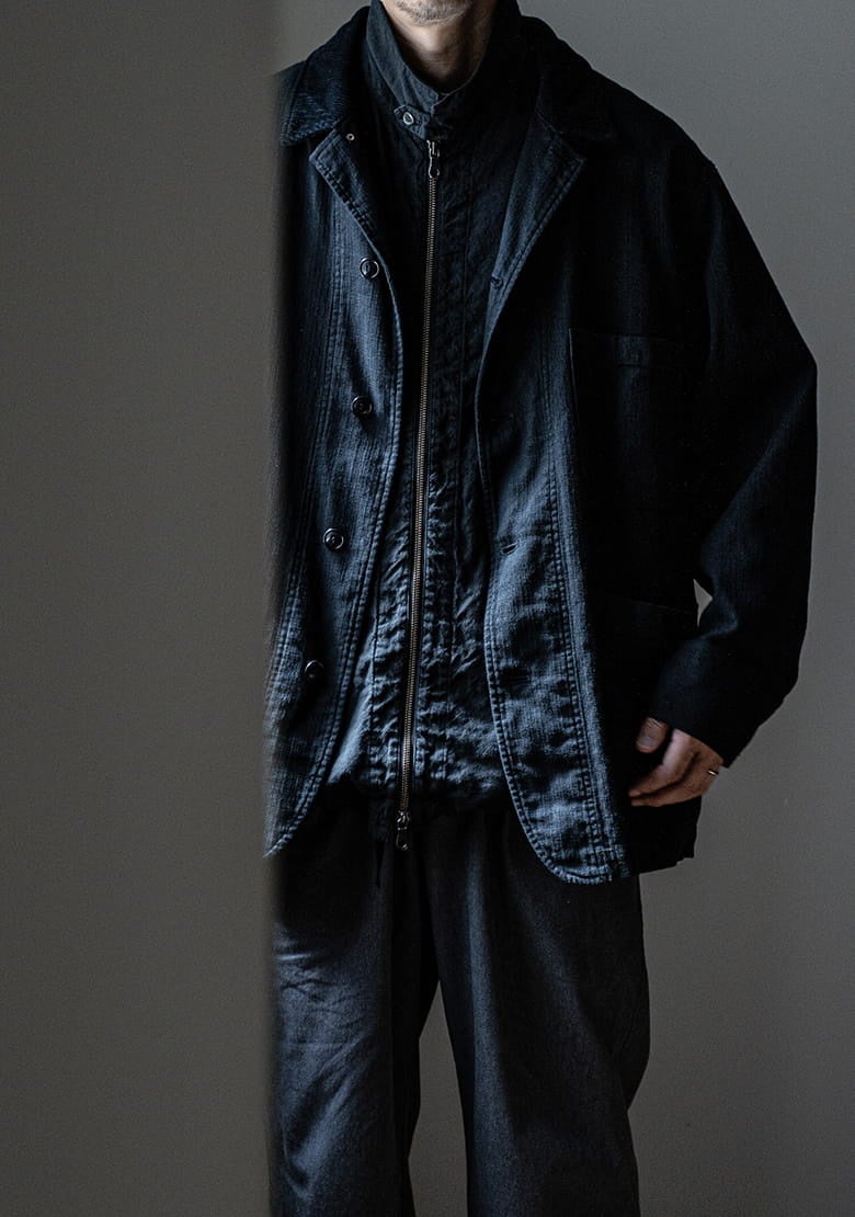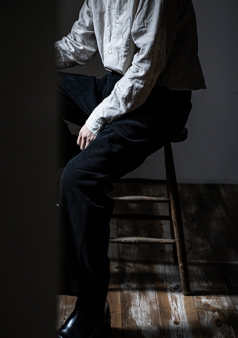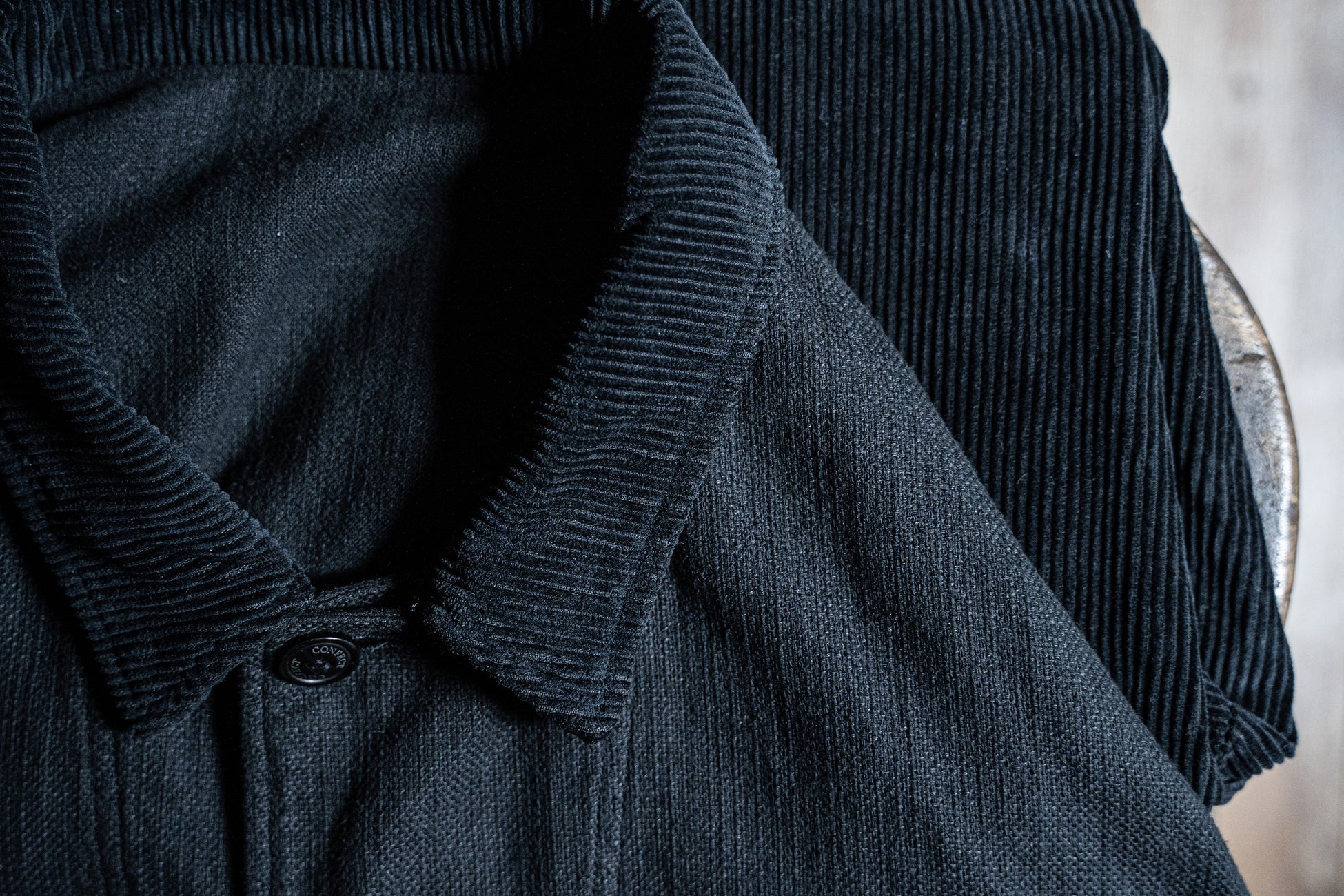 ボディに選んだプリペラ生地は、経緯糸の織り合わせが、遠目にも分かるダイナミックさ、そして近づいて見ると、浮き沈みする糸が陰影を成す、繊細さが共存しています。コーデュロイ素材もまた、畝と溝を持ち光と影を持ち合わせたファブリック。この有機的な顔を持つ自然素材の服を無機質な「黒」で覆い被せた製品染めを施し、色違いをご用意しました。一言で、「黒い服」と言い切ることができない、素材の存在感がなす、微かな質感の現れが、豊かな表情を浮き上がらせています。