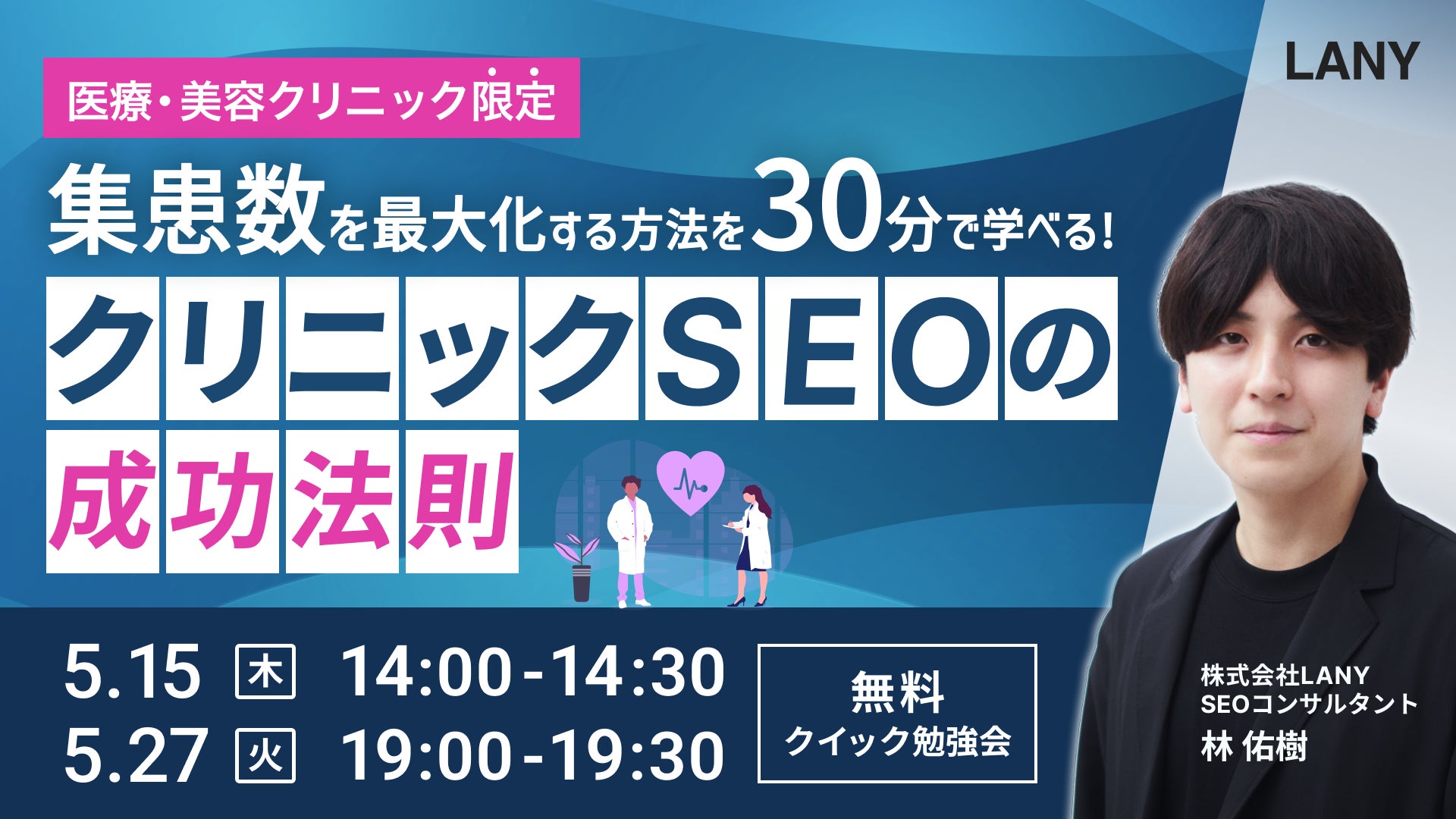 デジタルマーケティング支援を行う株式会社LANY(東京都渋谷区、代表取締役社長:竹内渓太)は、【無料勉強会】集患数を最大化させる、クリニックSEOの成功法則を5/15(木)・5/27(火)に開催いたします。